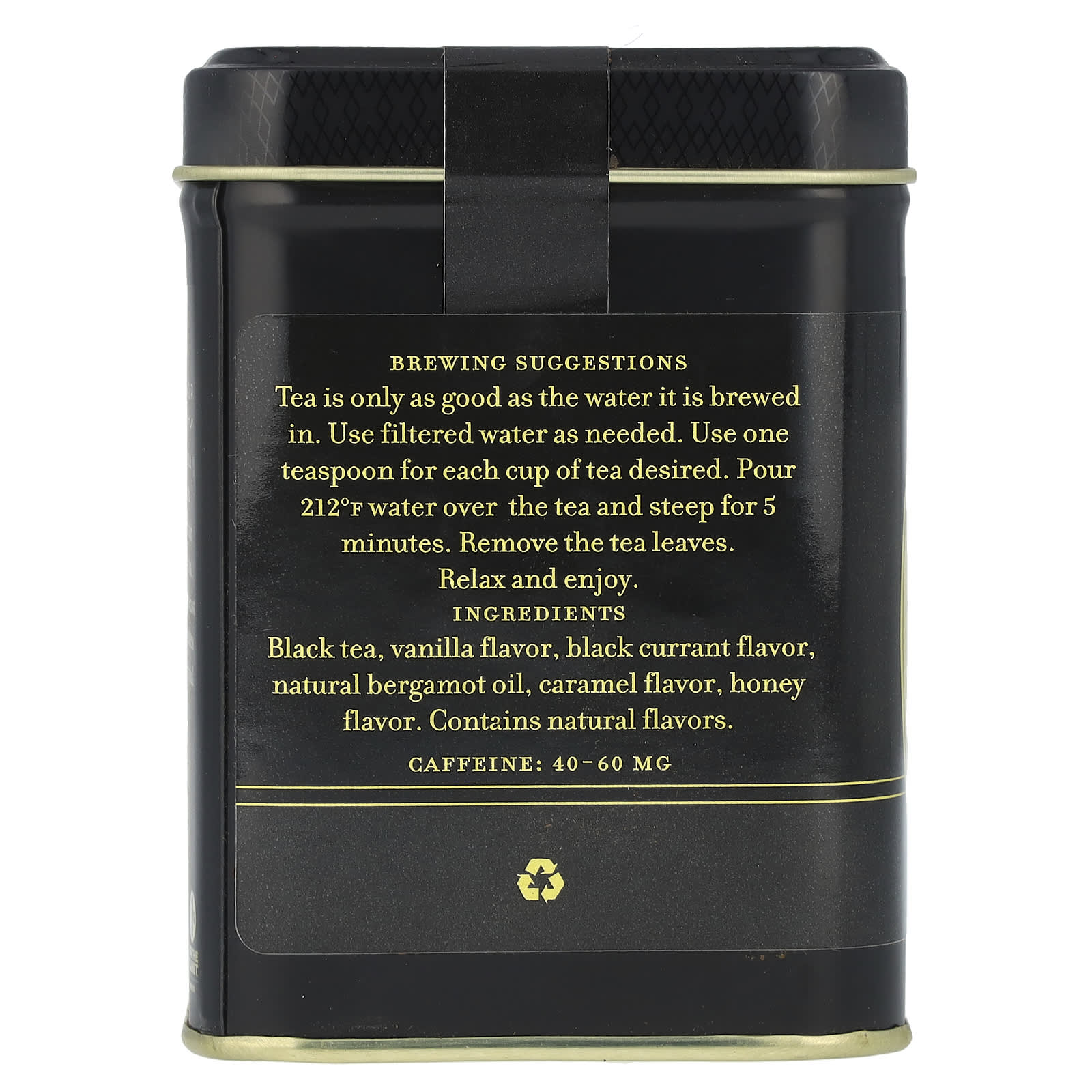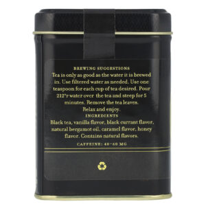 Chá preto, sabor de baunilha, sabor de groselha negra, óleo natural de bergamota, sabor de caramelo, sabor de mel.