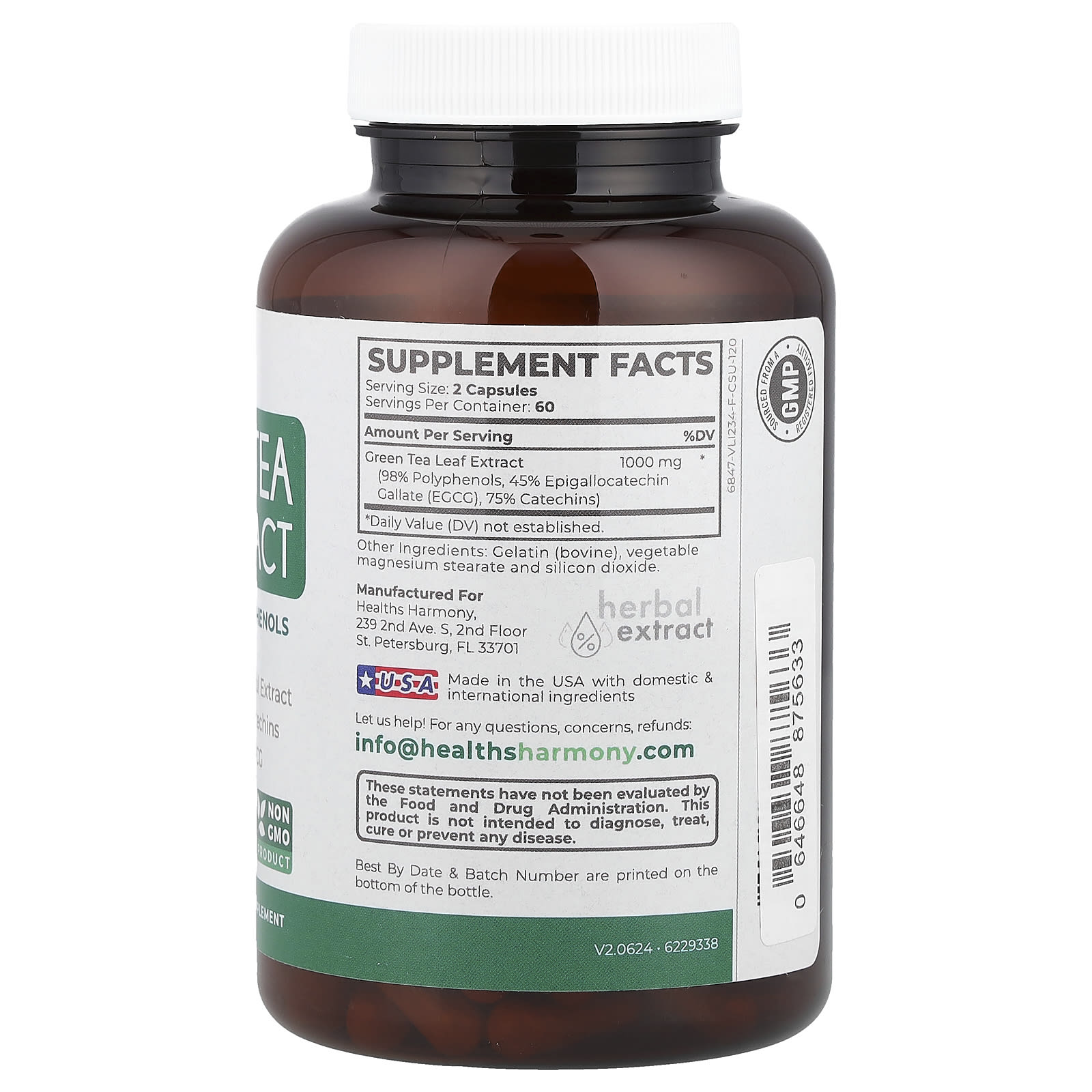 Healths Harmony Extrato de Chá Verde 98% 120 Cápsulas (500 mg por Cápsula) – Healths Harmony Suplementos Antioxidantes Extrato de chá verde.
