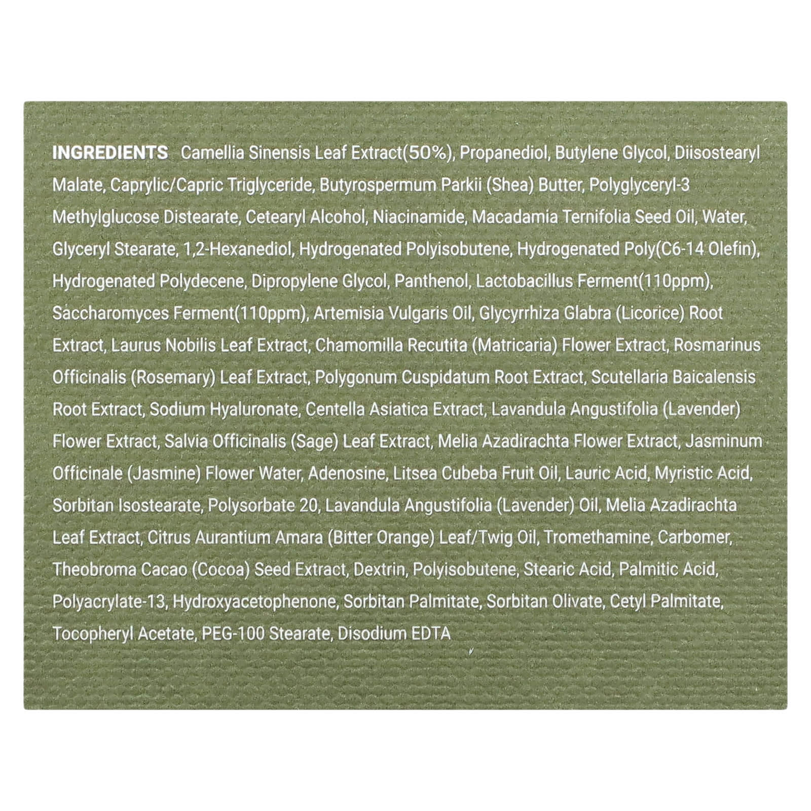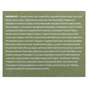 Extrato da folha de Camellia sinensis (50%), propanediol, butilenoglicol, diisostearyl malate, caprylic/capric triglyceride, manteiga de Butyrospermum parkii (karité), polyglyceryl-3 methylglucose distearate, álcool cetoestearílico, nicotinamida, óleo da semente de Macadamia ternifolia, água, monoestearato de glicerila, 1,2-hexanediol, hydrogenated polyisobutene, poli-hidrogenada (olefina c6-14), hydrogenated polydecene, dimetildietilenoglicol, pantenol, fermento de lactobacilos (110ppm), fermento de saccharomyces (110ppm), óleo de Artemisia vulgaris, extrato da raiz de Glycyrrhiza glabra (alcaçuz), extrato da folha de Laurus nobilis, extrato da flor de Chamomilla recutita (matricária), extrato da folha de Rosmarinus officinalis (alecrim), extrato da raiz de Polygonum cuspidatum, extrato da raiz de Scutellaria baicalensis, hialuronato de sódio, extrato de Centella asiatica, extrato da flor de Lavandula angustifolia (lavanda), extrato da folha de Salvia officinalis (sálvia), extrato da flor de Melia azadirachta, água da flor de Jasminum officinale (jasmim), adenosina, óleo da fruta de Litsea cubeba, ácido láurico, ácido mirístico, isoestearato de sorbitana, polissorbato 20, óleo de Lavandula angustifolia (lavanda), extrato da folha de Melia azadirachta, óleo da folha / galho de Citrus aurantium amara (laranja amarga), trometamol, carbômero, extrato da semente de Theobroma cacao (cacau), dextrina, poli-isobutileno, ácido esteárico, ácido palmítico, polyacrylate-13, hydroxyacetophenone, palmitato de sorbitano, sorbitan olivate, palmitato de cetila, acetato de tocoferol, estearato de PEG-100, edetato dissódico.