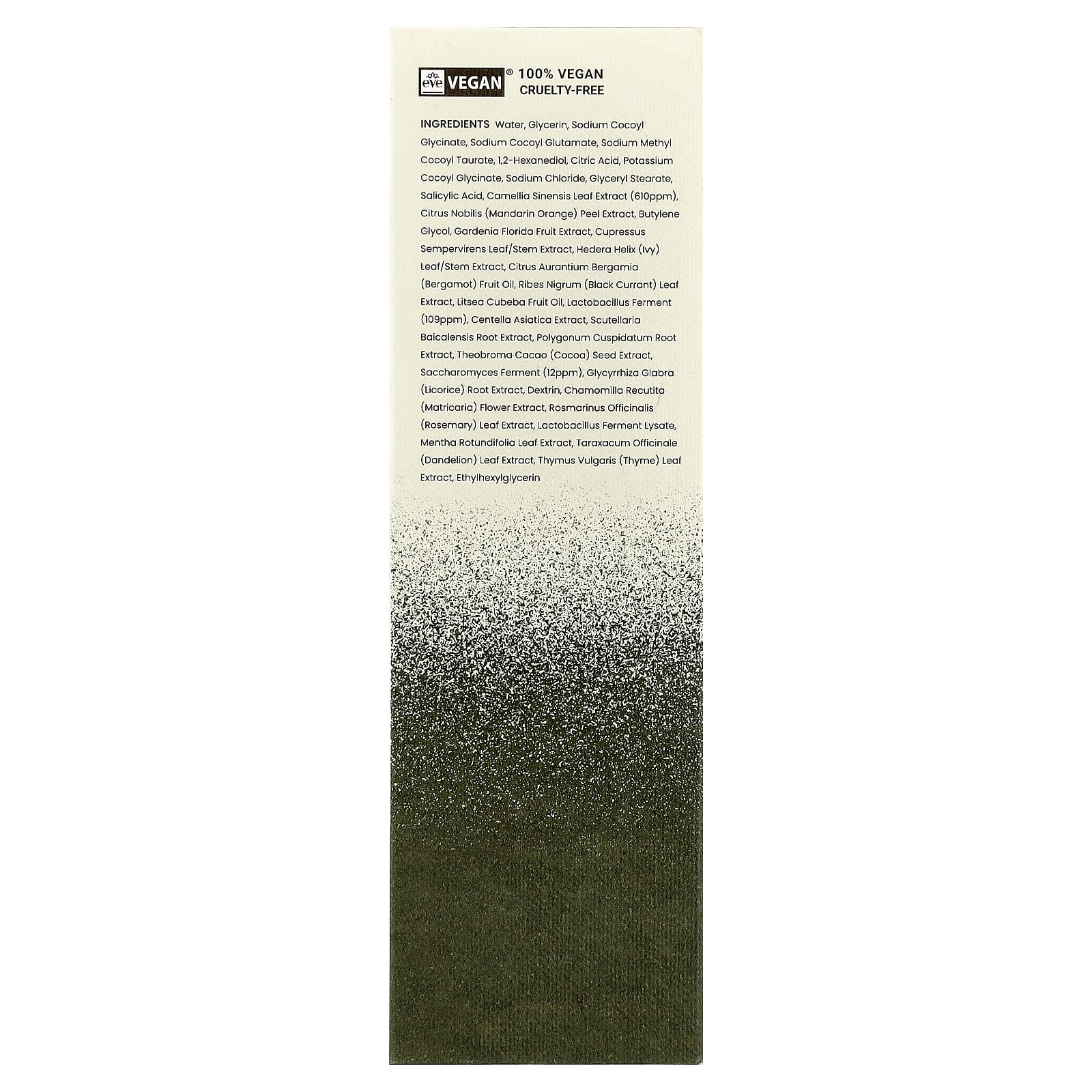 Água, glicerina, sodium cocoyl glycinate, sodium cocoyl glutamate, sodium methyl cocoyl taurate, 1,2-hexanediol, ácido cítrico, potassium cocoyl glycinate, cloreto de sódio, monoestearato de glicerila, ácido salicílico, extrato da folha de Camellia sinensis (610 ppm), extrato da casca de Citrus nobilis (mandarina), butilenoglicol, extrato da fruta de Gardenia florida, extrato de folha/caule de Cupressus sempervirens, extrato de folha/caule de Hedera helix (hera), óleo da fruta de Citrus aurantium bergamia (bergamota), extrato da folha de Ribes nigrum (groselha negra), óleo da fruta de Litsea cubeba, fermento de lactobacillus (109ppm), extrato de Centella asiatica, extrato da raiz de Scutellaria baicalensis, extrato da raiz de Polygonum cuspidatum, extrato da semente de Theobroma cacao (cacau), fermento de Saccharomyces (12 ppm), extrato da raiz de Glycyrrhiza glabra (alcaçuz), dextrina, extrato da flor de Chamomilla recutita (matricária), extrato da folha de Rosmarinus officinalis (alecrim), lisado do fermento de lactobacilos, extrato da folha de Mentha rotundifolia, extrato da folha de Taraxacum officinale (dente-de-leão), extrato da folha de Thymus vulgaris (tomilho), ethylhexylglycerin.