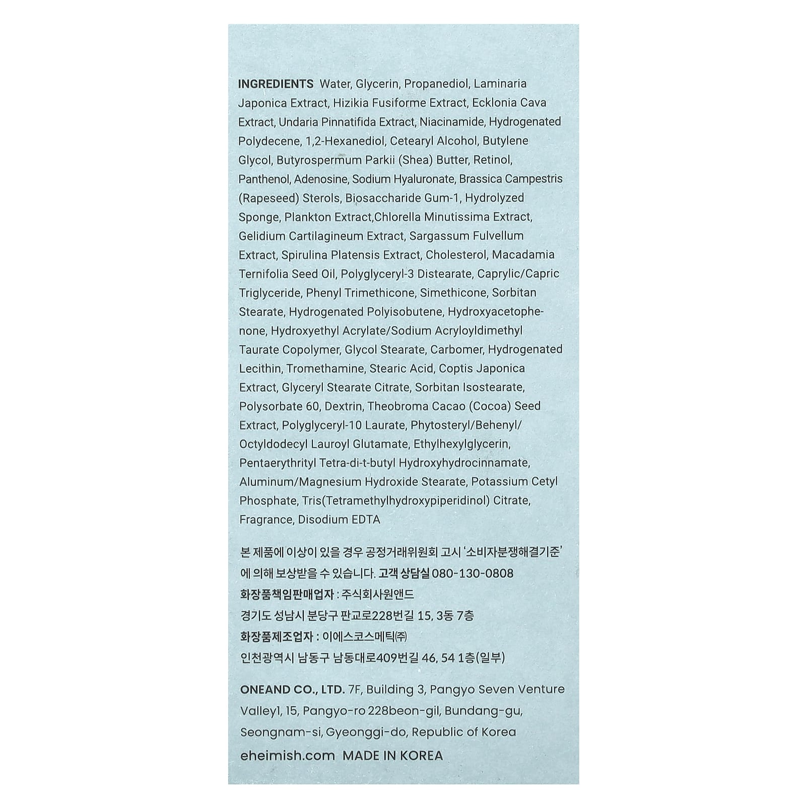 Água, glicerina, propanediol, extrato de Laminaria japonica, extrato de Hizikia fusiforme, extrato de Ecklonia cava, extrato de Undaria pinnatifida, nicotinamida, hydrogenated polydecene, 1,2-hexanediol, álcool cetoestearílico, butilenoglicol, manteiga de Butyrospermum parkii (karité), retinol, pantenol, adenosina, hialuronato de sódio, esteróis de Brassica campestris (colza), goma de biossacarídeo-1, esponja hidrolisada, extrato de plâncton,extrato de Chlorella minutissima, extrato de Gelidium cartilagineum, extrato de Sargassum fulvellum, extrato de Spirulina platensis, colesterol, óleo da semente de Macadamia ternifolia, polyglyceryl-3 distearate, caprylic/capric triglyceride, phenyl trimethicone, simeticona, estearato de sorbitana, poliisobuteno hidrogenado, hidroxiacetofenona, copolímero de acriloildimetiltaurato de sódio e acrilato de hidroxietila, monoestearato de etilenoglicol, carbômero, lecitina hidrogenada, trometamol, ácido esteárico, extrato de Coptis japonica, citrato de monoestearato de glicerila, isoestearato de sorbitana, polissorbato 60, dextrina, extrato da semente de Theobroma cacao (cacau), polyglyceryl-10 laurate, Phytosteryl/behenyl/octildodecyl lauroyl glutamate, ethylhexylglycerin, pentaerythrityl tetra-di-t-butyl hydroxyhydrocinnamate, estearato de hidróxido de alumínio/magnésio, fosfato cetílico de potássio, citrato de tris(tetrametil-hidroxipiperidinal), fragrância, edetato dissódico.