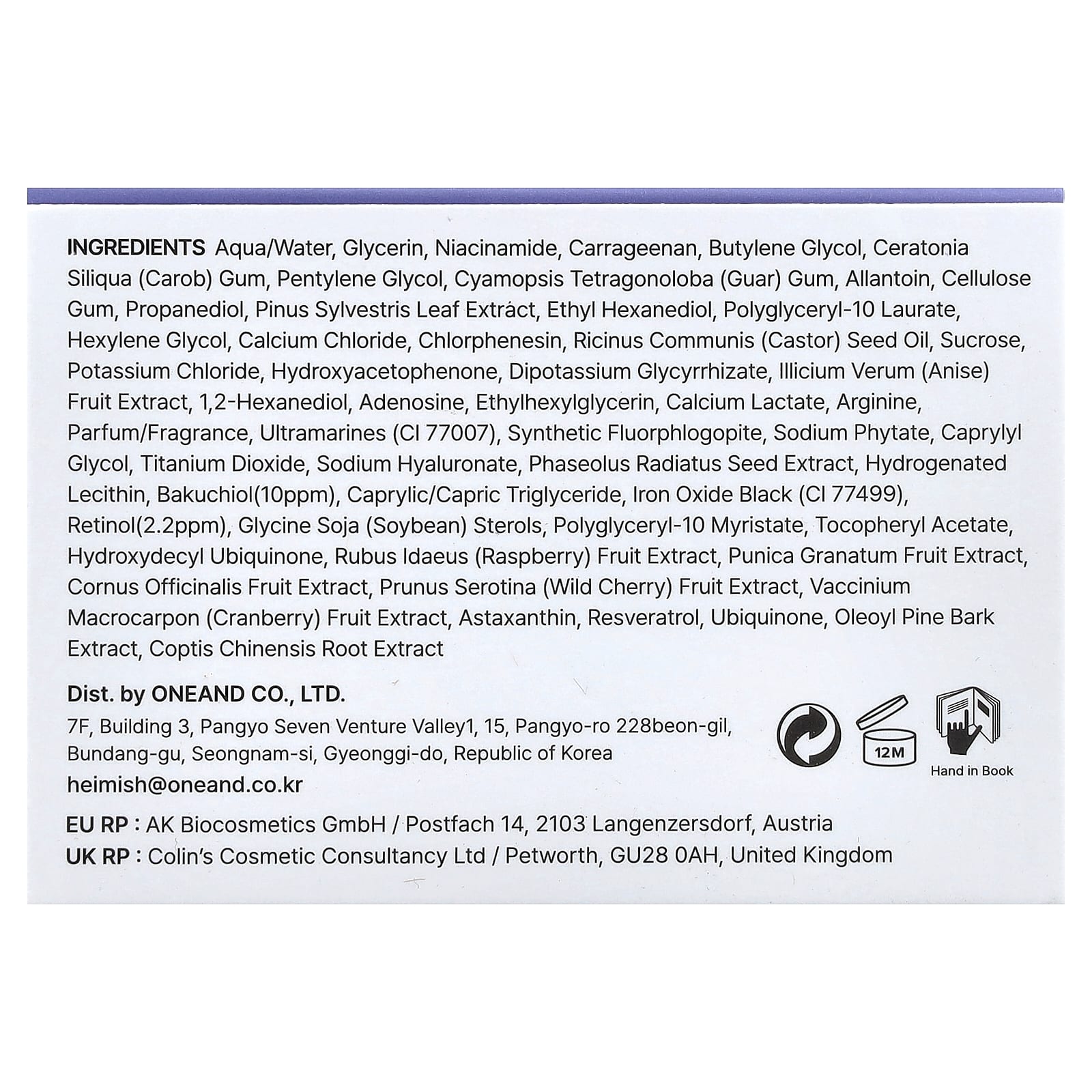 Água/aqua, glicerina, nicotinamida, carragenina, butilenoglicol, goma de Ceratonia siliqua (alfarroba), pentilenoglicol, goma de Cyamopsis tetragonoloba (guar), alantoína, goma de celulose, propanediol, extrato da folha de Pinus sylvestris, ethyl hexanediol, polyglyceryl-10 laurate, hexylene glycol, cloreto de cálcio, clorfenesina, óleo da semente de Ricinus communis (rícino), sacarose, cloreto de potássio, hydroxyacetophenone, dipotassium glycyrrhizate, extrato da fruta de Illicium verum (anis), 1,2-hexanediol, adenosina, ethylhexylglycerin, lactato de cálcio, arginina, perfume/fragrância, ultramarines (CI 77007), synthetic fluorphlogopite, fitato de sódio, caprylyl glycol, dióxido de titânio, hialuronato de sódio, extrato da semente de Phaseolus radiatus, lecitina hidrogenada, bakuchiol (10 ppm), caprylic/capric triglyceride, óxido de ferro preto (CI 77499), retinol (2,2 ppm), esteróis de glicina de soja (soja), polyglyceryl-10 myristate, acetato de tocoferol, hydroxydecyl ubiquinona, extrato da fruta de Rubus idaeus (framboesa), extrato da fruta de Punica granatum, extrato da fruta de Cornus officinalis, extrato da fruta de Prunus serotina (cereja silvestre), extrato da fruta de Vaccinium macrocarpon (cranberry), astaxantina, resveratrol, ubiquinona, extrato da casca de pinheiro oleoil, extrato da raiz de Coptis chinensis.