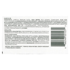 Ingredientes do Desenvolvedor: Aqua (água), peróxido de hidrogênio, ácido etidrônico, trideceth-9, cetrimonium chloride, propilenoglicol, óleo de rícino hidrogenado peg-40.
