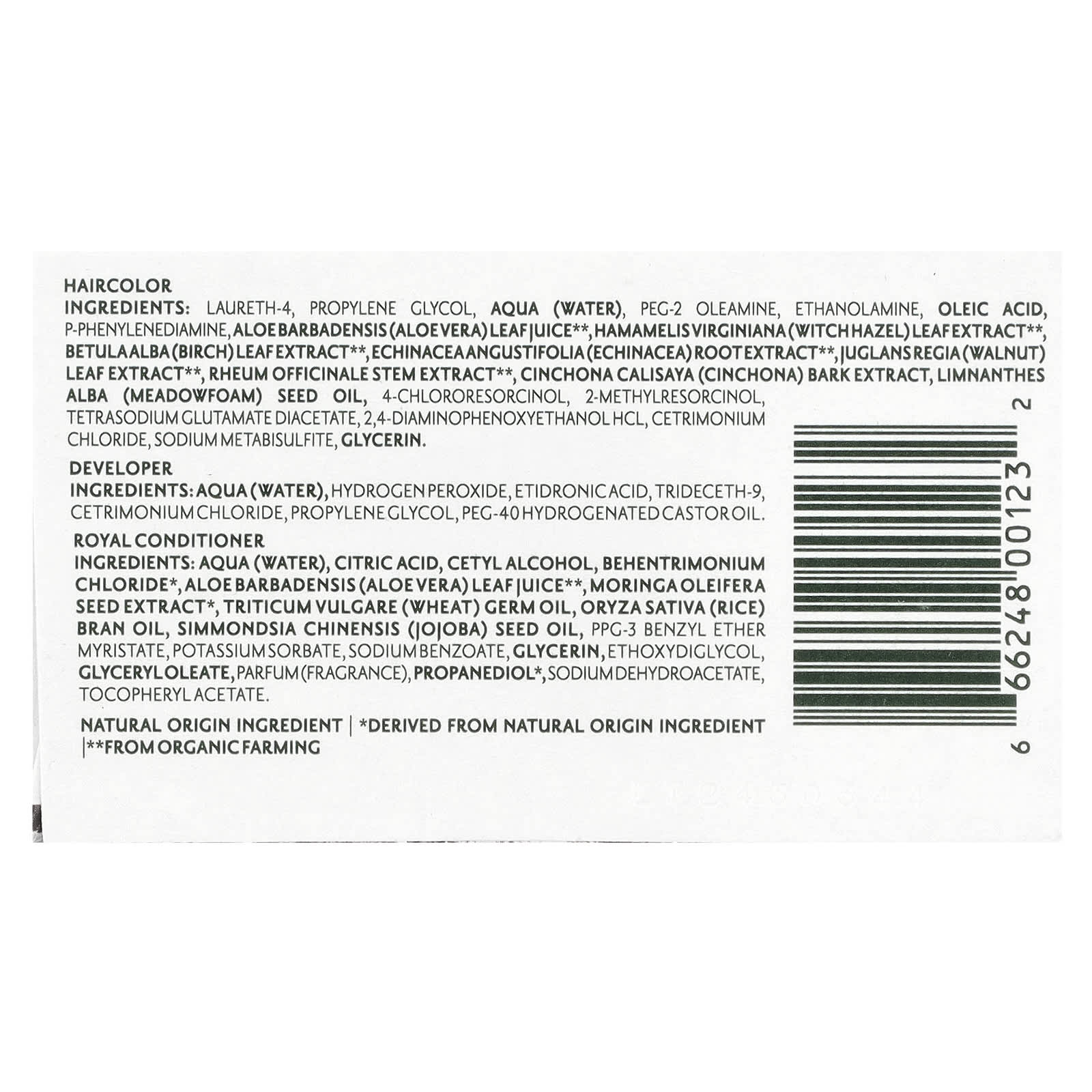 Ingredientes do Royal Cream: Aqua (água), ácido cítrico, álcool cetílico, behentrimonium chloride, *suco da folha de Aloe barbadensis (babosa), extrato da semente de Moringa pterygosperma (moringa), óleo do germe de Triticum vulgare (trigo), óleo de farelo de Oryza sativa (arroz), óleo da semente de Simmondsia chinensis (jojoba), ppg-3 miristato éter benzílico, sorbato de potássio, benzoato de sódio, glicerina, éter dietilenoglicol monoetílico, monoleato de glicerila, perfume (fragrância), propanediol, sodium dehydroacetate, acetato de tocoferol.
