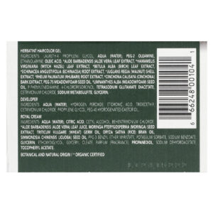 Ingredientes do gel de coloração para cabelos Herbatint: propilenoglicol Laureth-4, aqua (água), peg-2 oleamine, etanolamina, ácido oleico, * extrato da folha de Aloe barbadensis (babosa), * extrato da folha de Hamamelis virginiana (hamamélis), * extrato da folha de Betula alba (bétula), *extrato da raiz de Echinacea angustifolia (echinacea), * extrato da casca de Juglans regia (noz), * extrato da raiz de Rheum palmatum (ruibarbo), * extrato da casca de Cinchona calisaya (cinchona), óleo da semente de Limnanthes alba peg-75, * óleo da semente de Limnanthes alba (meadowfoam), p-fenilenodiamina 4-chlororesorcinol, tetrasodium glutamate diacetate, cetrimonium chloride, metabissulfito de sódio, glicerina.