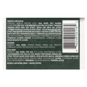 Ingredientes da Tintura para Cabelos: Laureth-4, propilenoglicol, aqua (água), peg-2 oleamine, etanolamina, ácido oleico, suco da folha de Aloe barbadensis (babosa) **, extrato da folha de Hamamelis virginiana(hamamélis) **, extrato da folha de Betula alba(bétula) ** extrato da raiz de Echinacea angustifolia(echinacea) **, extrato da folha de Juglans regia(noz) **, extrato do caule de Rheum officinale **, extrato da casca de Cinchona calisaya (cinchona), óleo da semente de Limnanthes alba (meadowfoam), p-fenilenodiamina, 2-amino-3-hidroxipiridina, p-aminofenol, m-aminofenol, tetrasodium glutamate diacetate, 4-chlororesorcinol, cetrimonium chloride, metabissulfito de sódio, glicerina.