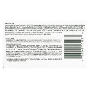 Royal creme: Aqua (água), ácido cítrico , álcool cetílico, cloreto de behentrimonium, * suco de folha de aloe barbadensis (aloe vera), extrato de semente de moringa pterygosperma (moringa), triticum vulgare (trigo) óleo de germe, oryza sativa (arroz) óleo de farelo , óleo de semente de simmondsia chinensis (jojoba) , miristato de éter benzílico ppg-3, metilglucet-20, oleato de etoxidiglicol, álcool isopropílico, desidroacetato de sódio, benzoato de sódio, parfum (fragrância), imidazolidinilureia, acetato de tocoferilo, glicerina.