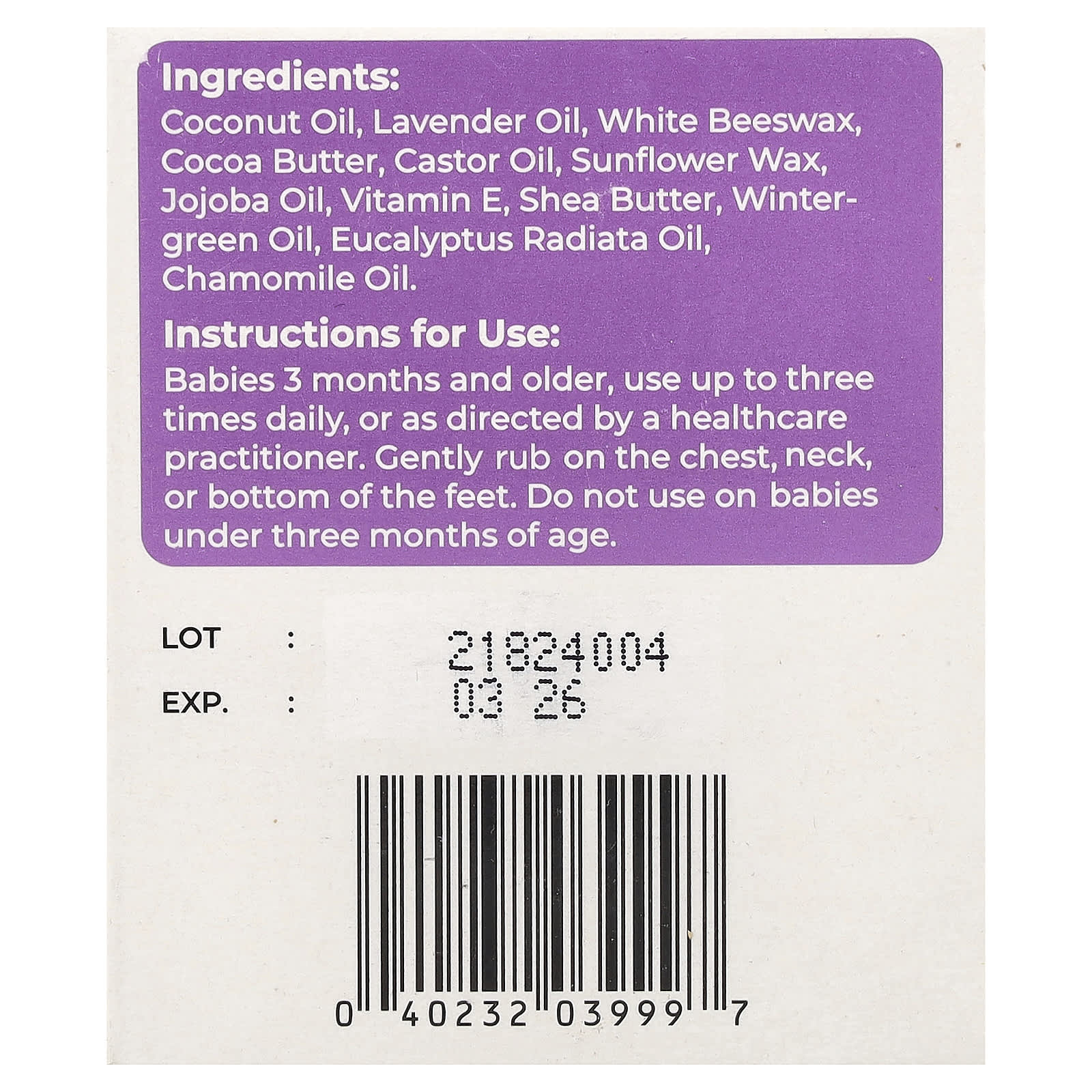 Bebês a partir de 3 meses devem usar até três vezes por dia ou conforme indicado por um profissional de saúde. Esfregue suavemente no tórax, no pescoço ou na parte inferior dos pés. Não use em bebês com menos de três meses de idade.