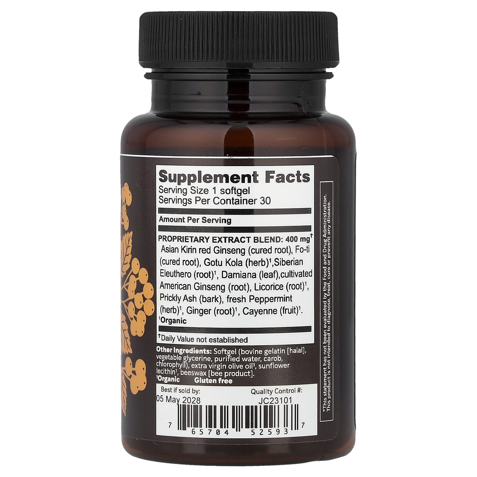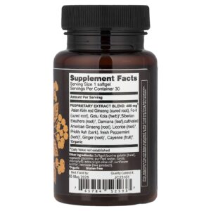 | Mistura de Extrato Patenteada: Ginseng vermelho Karin Asiático (raiz curada), Fo-ti (raiz curada), Gotu Kola (erva)¹, Eleutero Siberiano (raiz)¹, Damiana (folha), Ginseng Americano cultivado (raiz), Alcaçuz (raiz)¹, Espinhosa Cinza (casca), Hortelã-pimenta fresca (erva)¹, Gengibre (raiz)¹, Caiena (fruta)¹. |