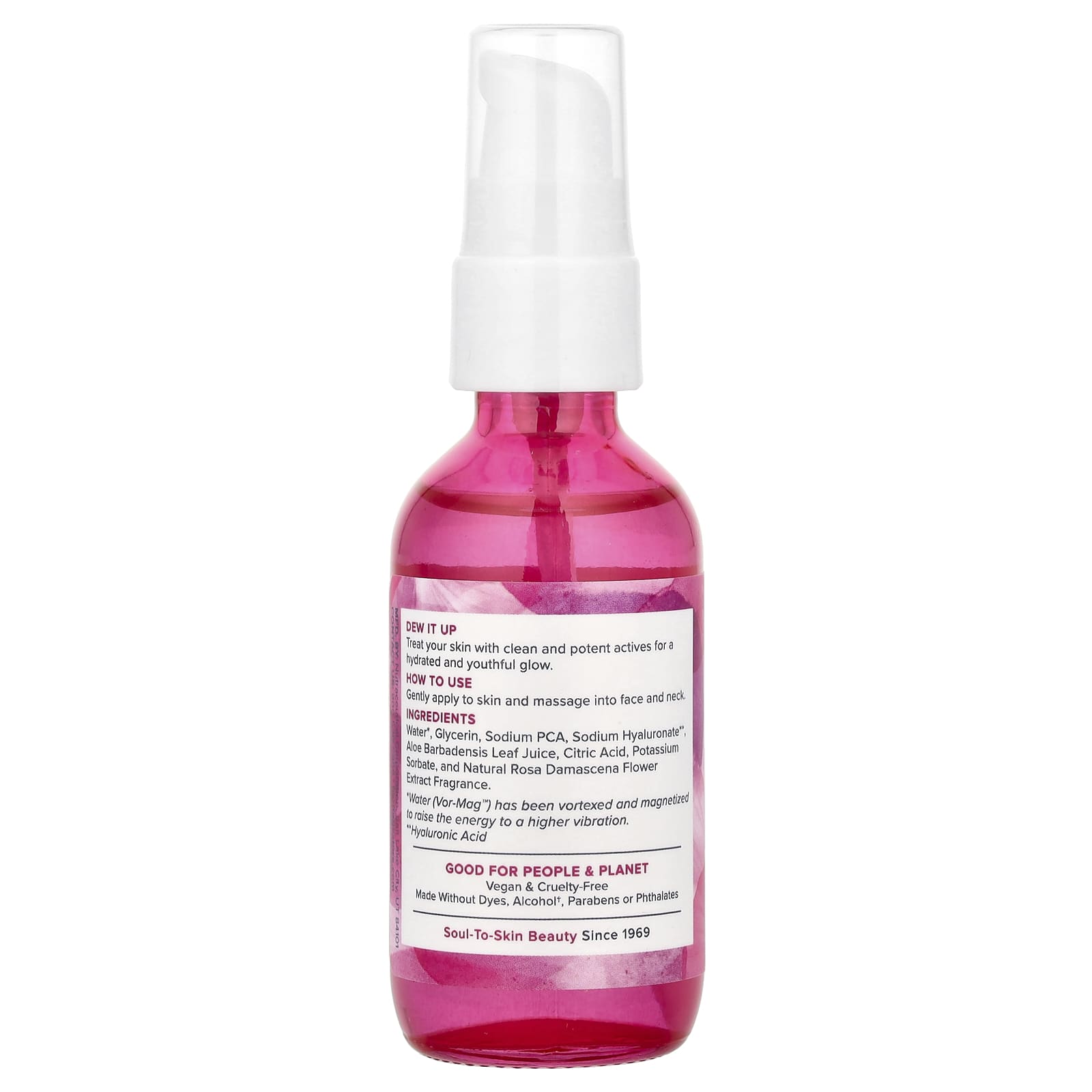 água purificada, glicerina (vegetal), pidolato de sódio, hialuronato de sódio (ácido hialurônico), suco da folha de Aloe barbadensis (babosa), ácido cítrico, sorbato de potássio e óleo de flor de Rosa damascena (rosa hidroessencial).