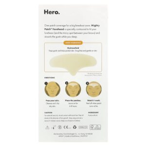Cobertura de um adesivo para uma grande zona de erupções cutâneas. A Testa Mighty Patch® é especialmente contornada para se encaixar na sua testa (e na área delicada entre as sobrancelhas) e absorver a sujeira enquanto você dorme.