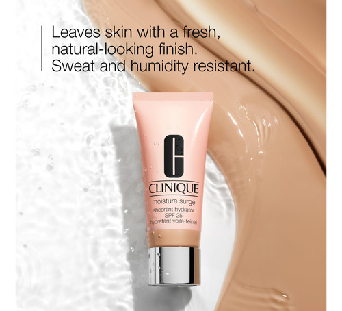 Hidratante Clinique Moisture Surge Sheertint Broad Spectrum SPF 25, muito leve — HIDRATANTE COLORIDO COM SPF: hidratante transparente para o rosto hidrata, aperfeiçoa e protege com SPF 25. Para todos os tipos de pele. – HIDRATAÇÃO DE 12 HORAS: Com ácido hialurônico e água de babosa ativada, esse hidratante transparente mantém a pele macia e úmida por 12 horas. – Acabamento com aparência natural: a maquiagem facial resistente ao suor e à umidade deixa a pele com um acabamento fresco e natural. – EXPERIÊNCIA CLÍNICA: testado contra alergias. 100% livre de fragrâncias. Não acnegênico. — BASEADO NA CIÊNCIA DERMATOLÓGICA: Como uma marca guiada por dermatologistas, o compromisso da Clinique com a segurança começa com a ciência dos cuidados com a pele. Fazemos parcerias com as melhores mentes em dermatologia e formulamos para todos os tipos, tons e preocupações de pele a serviço de todas as peles.