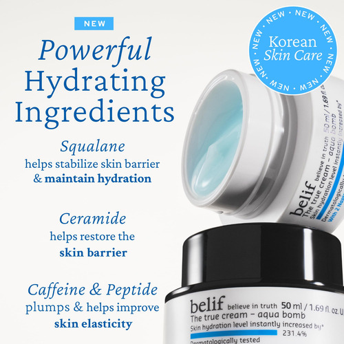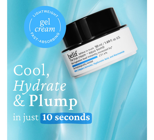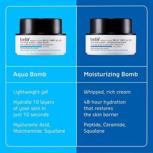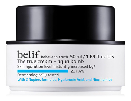 belif The True Cream Aqua Bomb, hidratante facial leve diário, creme facial hidratante e hidratante, ácido hialurônico, niacinamida, esqualano, para todos os tipos de pele, sem óleos minerais, cuidados com a pele coreanos – Alvos: secura, embotamento, textura irregular – Formulação: gel leve – Tipos de pele: normal, mista, seca, oleosa – Testado dermatologicamente – Formulado sem: óleo mineral, fragrância sintética (menos de 1%), cores sintéticas, conservantes sintéticos