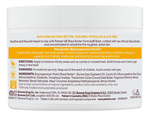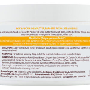 Fórmula de manteiga de karité Palmers Bálsamo de manteiga de karité crua africana, hidratante corporal nutritivo para pele áspera e seca, 7,25 onças — Bálsamo de manteiga corporal sólida de karité crua e natural de origem sustentável derrete diretamente em um óleo não oleoso que aumenta o brilho ao entrar em contato, suavizando instantaneamente até mesmo a pele mais seca, como cotovelos e pés – Fatores naturais: a manteiga de karité africana nutre profundamente nutre e suaviza a pele, a vitamina E rejuvenesce e combate os danos dos radicais livres, o óleo de soja ajuda a prevenir a desidratação da pele e a manteiga de cacau melhora o tom e a textura – Melhor Ingredientes: Nós nos esforçamos para usar apenas os melhores ingredientes naturais e crus para deixar seus cabelos e pele macios, hidratados e bonitos; apoiamos a produção sustentável de manteiga de karité e cacau e óleo de coco em todo o mundo – Escolha o que é real: nossos produtos de beleza e tratamentos para cabelo e pele apresentam ingredientes vegetais de alta qualidade em fórmulas que realmente funcionam para hidratar e suavizar, de protetor labial a sabonete em barra e manteiga corporal – Por que Palmers? Por mais de 180 anos, a Palmer’s criou produtos de beleza voltados para o tratamento usando manteiga de cacau, óleo de coco, manteiga de karité, azeite de oliva e vitamina E para acalmar, hidratar, suavizar, reabastecer e revitalizar a pele e o cabelo