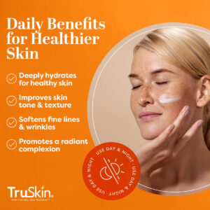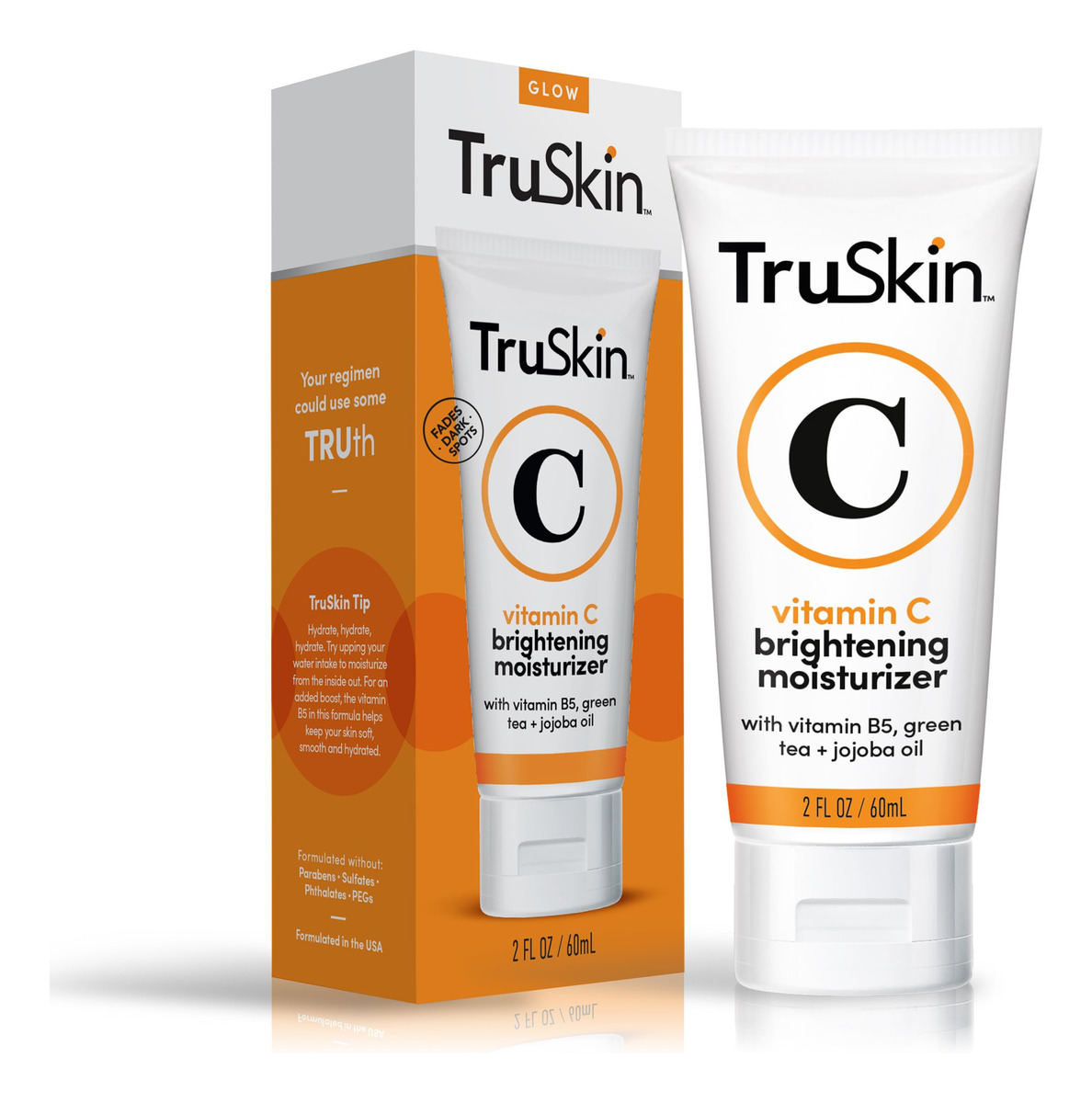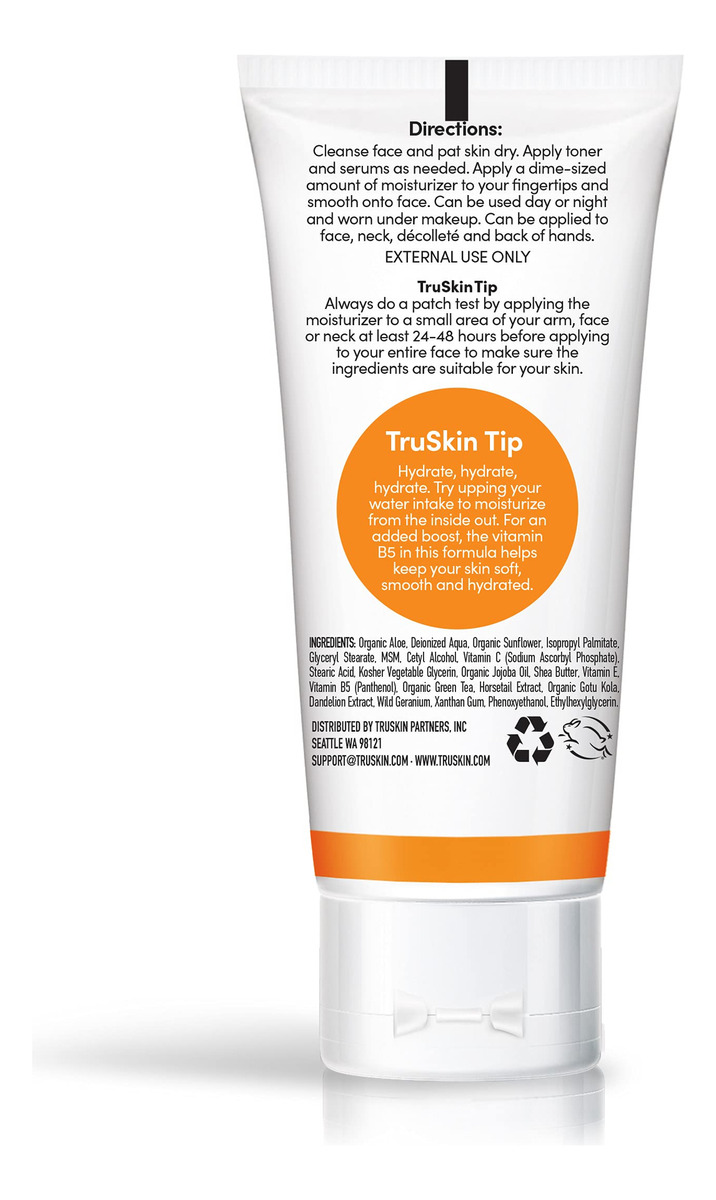 Hidratante facial TruSkin com vitamina C para mulheres, clareador, antienvelhecimento, hidratante, creme para rugas cutâneas, vitamina B5, vitamina E, óleo de jojoba, aloe vera e chá verde — HIDRATAÇÃO ILUMINADORA: o creme facial nutritivo à base de vitamina C à base de aloe atua para promover a saúde natural da pele e promover uma tez uniforme e radiante; hidratante facial leve e hidratante para melhorar a textura, o tom da pele, as linhas finas e as rugas – COMPLEXO ANTIENVELHECIMENTO DIÁRIO: Formulado para ser o melhor hidratante facial para mulheres com vitamina C, além de chá verde rico em nutrientes, babosa e vitaminas B5 e E a ilumina, suaviza e reabastece, além de MSM para aumentar a absorção de uma pele hidratada e com aparência saudável – MELHOR FORMA DE VITAMINA C: O fosfato de ascorbil sódico altamente estável mantém a potência por mais tempo com menos ardor na pele do que outras formas comumente usadas de vitamina C; o creme facial hidratante iluminador TruSkin foi criado para todos os tipos de pele sem adição de fragrância – COMO APLICAR: Depois de limpar e usar tônico ou soro conforme necessário, aplique uma quantidade pequena de hidratante facial na ponta dos dedos e espalhe no rosto; como acontece com todos os produtos para cuidados com a pele facial, teste diariamente a loção facial 24 horas antes do uso; somente para uso externo – A DIFERENÇA DA TRUSKIN: Se por algum motivo você decidir que este produto não é adequado para sua pele, estamos aqui para ajudá-lo. Cada mistura propositadamente equilibrada dos principais antioxidantes, supernutrientes e ativos botânicos nutritivos aumenta a eficácia e oferece benefícios para a pele, sem adição de aditivos ou fragrâncias. A data de validade está impressa no adesivo de código de barras anexado à embalagem.