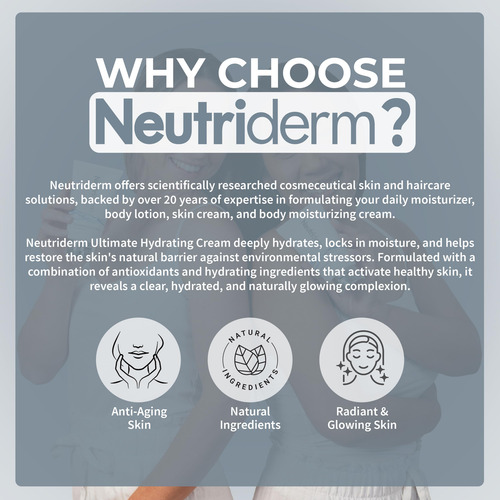O Creme Hidratante Neutriderm Ultimate é uma potência no cuidado da pele, oferecendo uma abordagem multifacetada para obter uma tez impecável. Este hidratante facial ultra hidratante oferece hidratação intensa enquanto reduz as imperfeições e protege a pele dos danos causados pelos estressores ambientais. Enriquecido com antioxidantes potentes, ele ativa as células saudáveis da pele para revelar uma aparência mais suave e radiante. No centro de sua formulação está a vitamina E, conhecida por suas propriedades hidratantes profundas e capacidade de proteger as células da pele do estresse oxidativo. Esse ingrediente chave garante que sua pele permaneça hidratada e resistente. Além disso, o dióxido de titânio está incluído por suas propriedades naturais de reflexão da luz. Esse mineral contribui para uma tez mais radiante, proporcionando um brilho natural e se adaptando bem à rotina de cremes hidratantes faciais. Ideal para peles secas e sensíveis, o hidratante facial Neutriderm Ultimate é o melhor hidratante para rosto, combinando hidratação intensa com benefícios de creme facial hidratante. Ele se destaca entre os hidratantes para pele seca por suas propriedades extras hidratantes e ultra hidratantes, tornando-o um complemento essencial para qualquer rotina de cuidados com a pele seca do rosto. É o hidratante pré-maquiagem perfeito, fornecendo a melhor tela preparada para aplicação de maquiagem. Formulado com vitamina E, este creme hidrata profundamente e protege contra o estresse oxidativo, aumentando a resiliência da pele. Também inclui esqualano para suavidade, proteína de trigo hidrolisada e pó de arroz para seus efeitos calmantes e matificantes da pele e dióxido de titânio para um brilho natural. Essa combinação oferece cuidados abrangentes para uma tez impecável e hidratada. – HIDRATAÇÃO E HIDRATAÇÃO INTENSAS: O creme facial ultra hidratante Neutriderm oferece hidratação profunda com o poder da vitamina E e da proteína do trigo. O creme facial premium leve e não oleoso para pele seca retém a umidade, deixando sua pele macia, flexível e revigorada. – ANTIENVELHECIMENTO E REDUÇÃO DE RUGAS: Nosso hidratante facial para pele seca é um creme facial hidratante multitarefa feito para produzir uma aparência jovem e revitalizada. Este hidratante para cuidados com a pele é enriquecido com antioxidantes potentes para ajudar a evitar danos causados por estressores ambientais, reduzir as linhas finas e revelar uma pele mais suave. – PELE PERFEITA: feito com proteína de trigo hidrolisada, rica em aminoácidos e peptídeos, o creme facial Neutriderm Deep Moisture ajuda a manter a umidade, elasticidade e minimizar os poros, enquanto o dióxido de titânio reflete a luz para um brilho vibrante. O pó de arroz acalma a irritação e absorve a oleosidade, matificando a pele para uma pele perfeita e preparada para maquiagem. – Alívio calmante da vermelhidão: este creme hidratante para a pele, formulado com vitamina E, proporciona alívio calmante para a pele irritada. Reduz eficazmente a vermelhidão e acalma o desconforto, tornando-o ideal para peles sensíveis. Nosso creme hidratante facial também promove a cura para todos os tipos de pele. – PERFEITO PARA USO DIÁRIO: Este hidratante facial é ideal para homens e mulheres. Sua fórmula não comedogênica é adequada para todos os tipos de pele. Use-o como um hidratante facial superhidratante e primer de maquiagem em sua rotina matinal ou noturna para melhorar a saúde da pele e obter uma tez mais radiante.