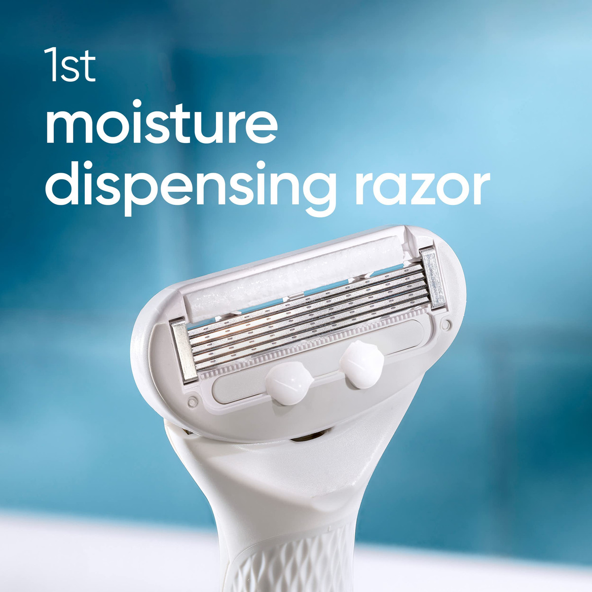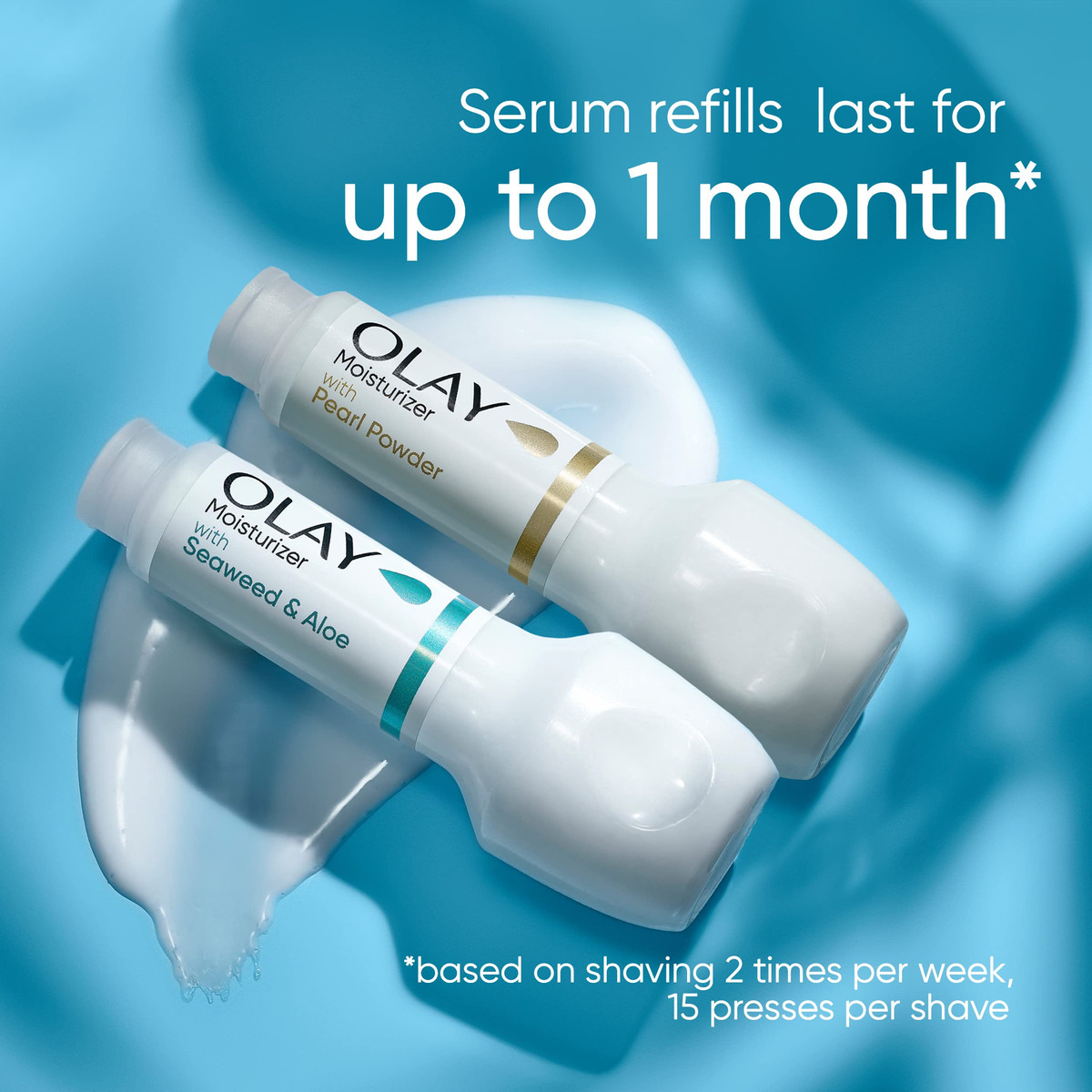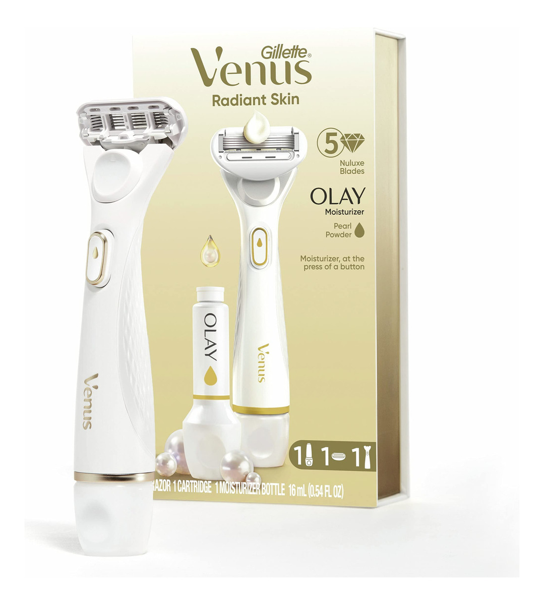 Máquina de barbear feminina Gillette Venus Radiant Skin para pele seca e sensível com dispensador de hidratante Olay, 1 sérum e 1 refil de lâmina de barbear — a primeira máquina de barbear dispensadora de hidratante do mundo com soro hidratante Olay. Deixe a pele seca após o barbear no passado e retenha a umidade instantaneamente – Com o melhor cartucho Venus com 5 lâminas Nuluxe e uma solução revolucionária: duas portas autolimpantes do cartucho permitem que o hidratante passe para um barbear verdadeiramente suave – Com o hidratante Olay para uma pele macia e sedosa após o barbear: hidrate a pele enquanto se barbeia e desfrute do aroma floral e do toque dos minerais marinhos de um frasco facilmente substituível que dura um mês inteiro – basta pressionar o botão, liberar a quantidade de hidratante Olay necessária para cada golpe e finalizar com um enxágue rápido. Não são necessárias baterias — Alça luxuosa à prova d'água que se encaixa perfeitamente na sua mão e um revolucionário botão dispensador de hidratante para levar os mimos a um novo patamar. Barbeie-se como você cuida da pele, trate sua pele seca e sensível com a hidratação necessária e barbeie-se bem sem ter que lidar com a pele seca depois. – Como usar: clique nas lâminas e no hidratante. Pressione o botão para liberar o hidratante. Raspe e pressione o botão novamente a cada poucos movimentos. Enxágue e desfrute de uma pele esfoliada, macia e hidratada.