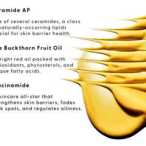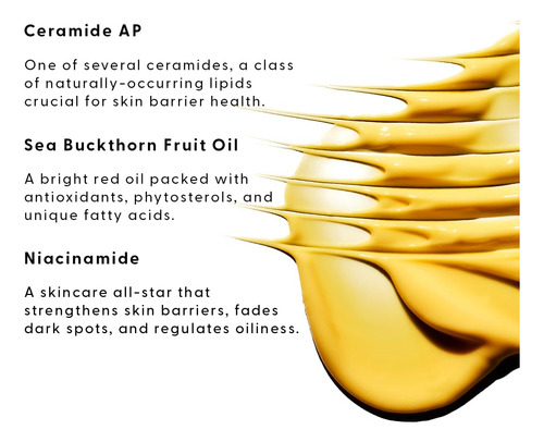 – Ingredientes principais. As ceramidas hidratam e reforçam sua barreira de umidade. O óleo de espinheiro marítimo fortalece e acalma. A niacinamida regula a renovação celular, atenua as manchas escuras e reduz a aparência de linhas finas.