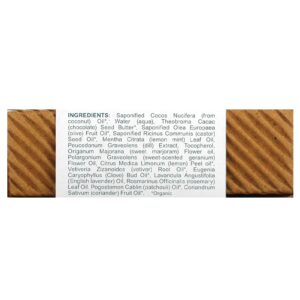 Óleo de cocos nucifera saponificado (de coco) *, água (aqua), manteiga de semente de Theobroma cacao (chocolate) *, óleo da fruta Olea europaea saponificada *, óleo da semente de Ricinus communis saponificada *, óleo da folha de Mentha citrata (limão e hortelã), extrato de peucedanum graveolens (endro), tocoferol, óleo da flor de Origanum majorana (manjerona), óleo da flor de Pelargonium graveolens (gerânio com aroma doce), óleo da casca de Citrus medica limonum (limão siciliano)*, óleo da raiz de vetiveria zizanoides (vetiver) *, óleo do botão de Eugenia caryophyllus (cravo)*, Lavandula angustifolia (lavanda inglesa) óleo, óleo da folha de Rosmarinus officinalis (alecrim), óleo de Pogostemon cablin (patchuli) *, óleo da fruta coriandrum sativum (coentro) *.
