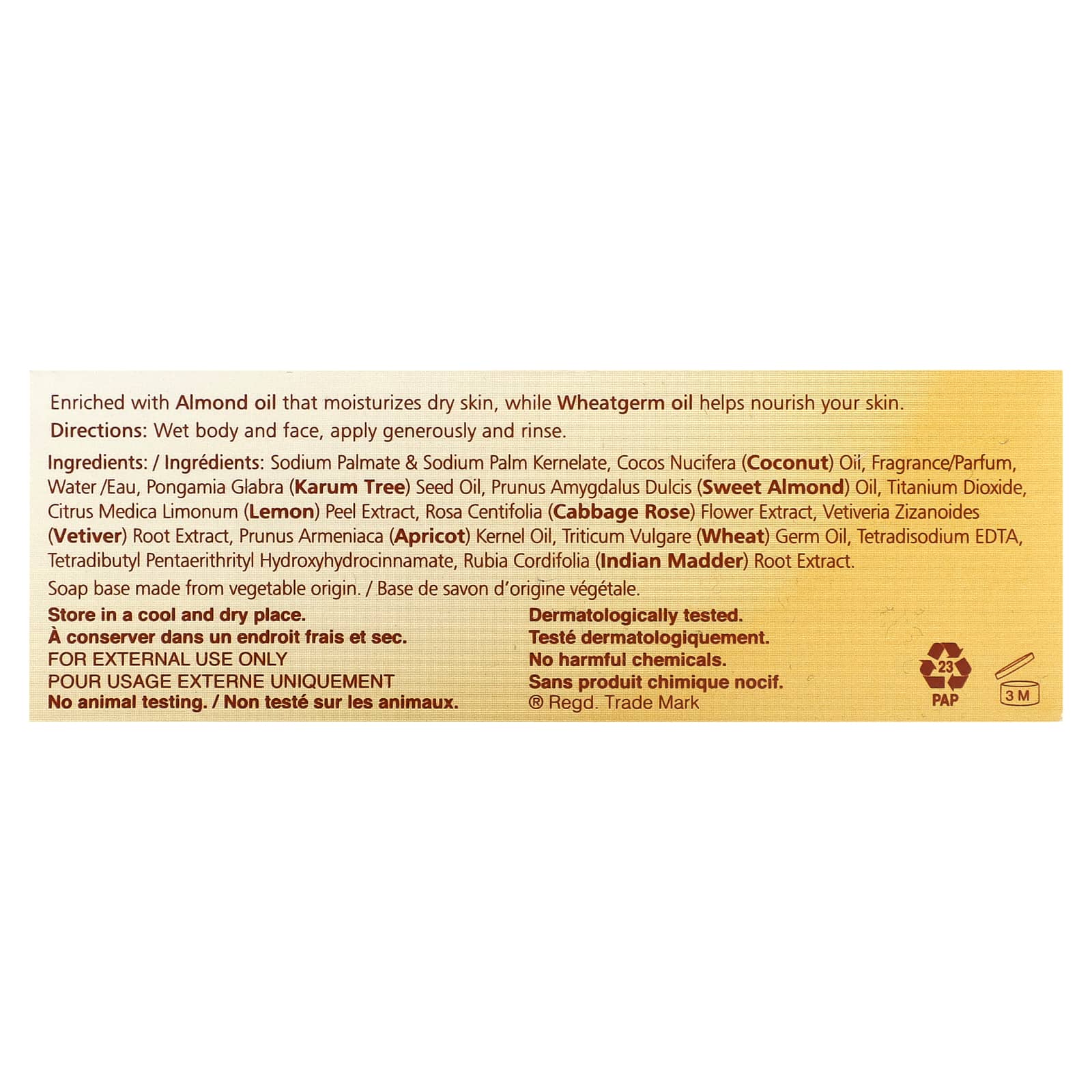 Sodium palmate & sodium palm kernelate, óleo de Cocos nucifera (coco), fragrância/perfume, água / eau, óleo da semente de Pongamia glabra (árvore de karum), óleo de Prunus amygdalus dulcis (amêndoa doce), dióxido de titânio, extrato da casca de Citrus medica limonum (limão), extrato da flor de Rosa centifolia (rosa-repolho), extrato da raiz de Vetiveria zizanoides (vetiver), óleo da semente de Prunus armeniaca (damasco), óleo do germe de Triticum vulgare (trigo), tetradisodium edta, tetradibutyl pentaerithrityl hydroxyhydrocinnamate, extrato da raiz de Rubia cordifolia (garança indiana).