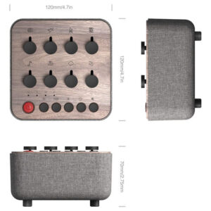 Dimensão: :91 x 54 mm Fonte de alimentação: Entrada DC 5V/1A Idade:: Cabo de carregamento USB-C* 1 manual do usuário 1 Opção de som: 8 sons suaves Função de temporizador: :30/60/90 minutos Função de memória: :Status da última utilização da gravação
