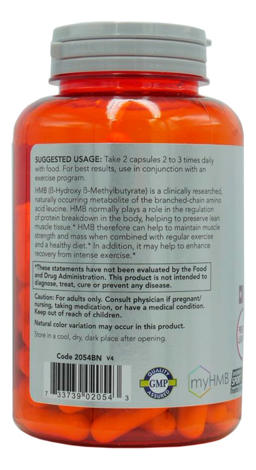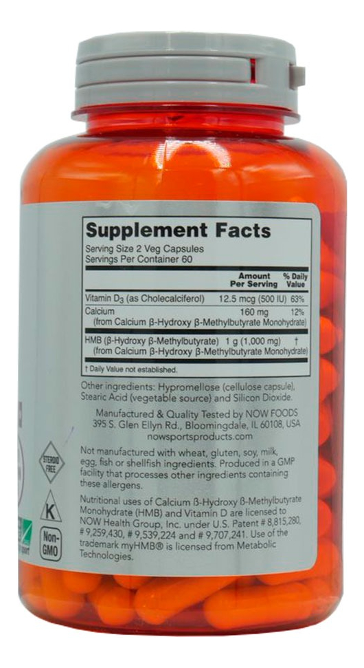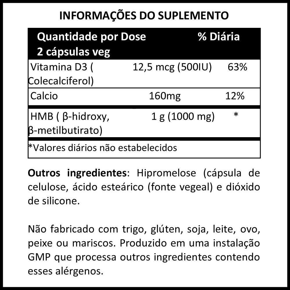 HMB 500mg com Vitamina D3 Now Foods 120Vcaps Com Vitamina D-3 HMB (ß-Hydroxy ß-Methylbutyrate) é um metabólito natural do aminoácido de cadeia ramificada leucina, clinicamente pesquisado. O HMB normalmente desempenha um papel na regulação da degradação de proteínas no corpo, ajudando a preservar o tecido muscular magro. O HMB, portanto, pode ajudar a manter a força e a massa muscular quando combinado com exercícios regulares e uma dieta saudável. Além disso, pode ajudar para melhorar a recuperação de exercícios intensos. Outros Ingredientes: Hipromelose (cápsula de celulose), Ácido Esteárico (fonte vegetal) e Dióxido de Silício. Não contém ingredientes de trigo, glúten, soja, leite, ovo, peixe ou marisco. Produzido em uma instalação de GMP que processa outros ingredientes contendo esses alérgenos. Apenas para adultos. Consulte um profissional se estiver grávida / amamentando, ou se tiver um problema.