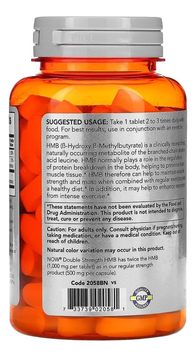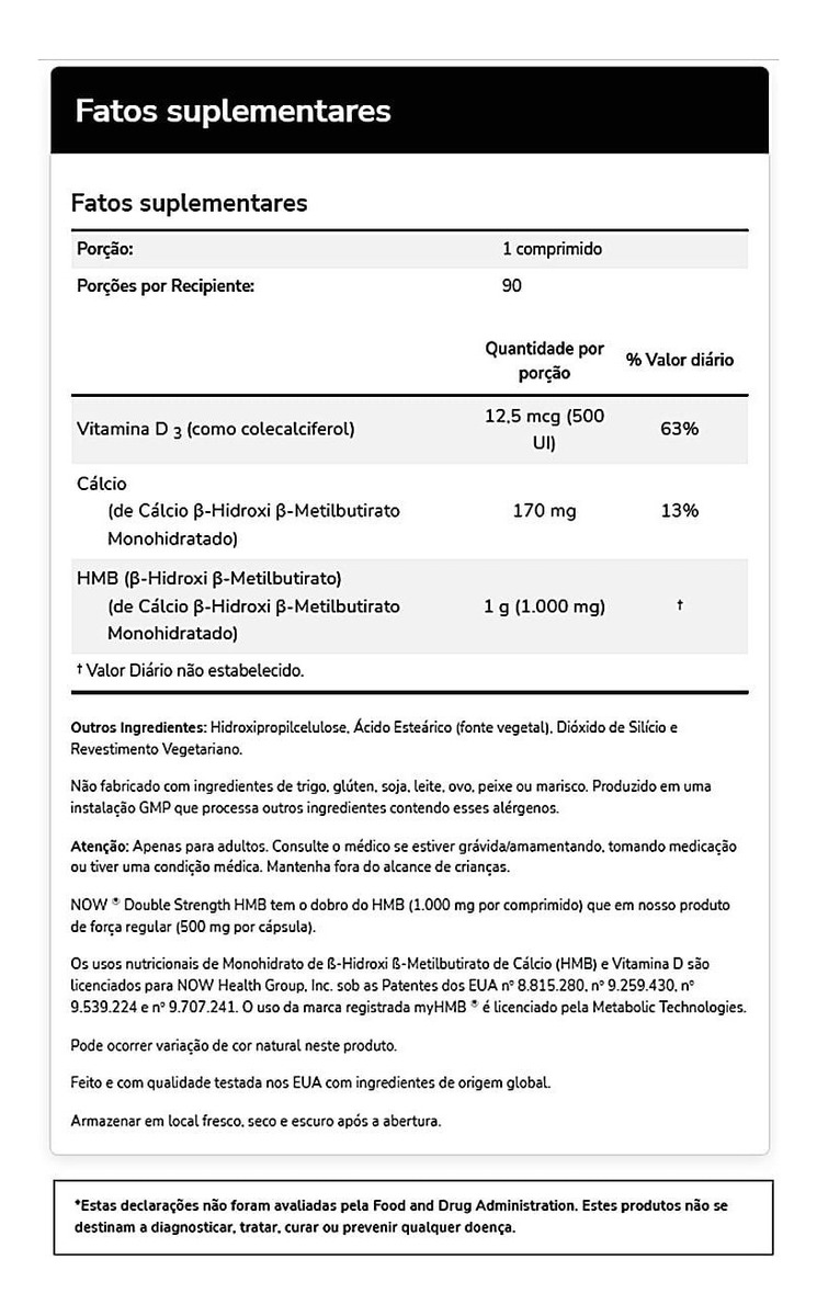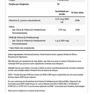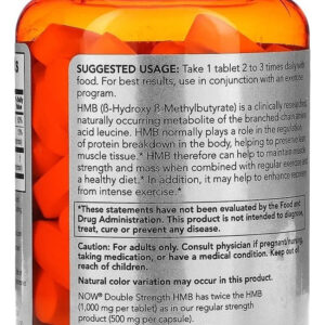 HMB 1000mg 90 Tabletes Now Foods é um suplemento alimentar que fornece -hidroxi- metilbutirato, um composto natural produzido durante o metabolismo do aminoácido l-leucina, um dos aminoácidos de cadeia ramificada BCAAs. A dose recomendada de HMB é de 3g por dia para pessoas de tamanho médio, sendo difícil obter essa quantidade apenas pela dieta devido à conversão ineficiente de leucina em HMB.