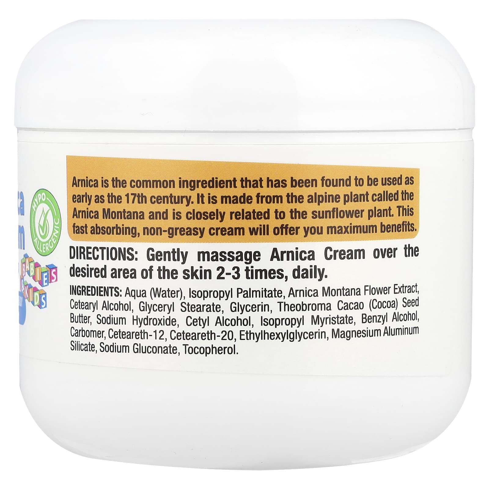 Aqua (água), palmitato de isopropila, extrato da flor de Arnica montana, álcool cetoestearílico, monoestearato de glicerila, glicerina, manteiga da semente de Theobroma cacao (cacau), hidróxido de sódio, álcool cetílico, miristato de isopropila, álcool benzílico, carbômero, ceteareth-12, ceteareth-20, ethylhexylglycerin, silicato de alumínio e magnésio, gliconato de sódio, tocoferol.