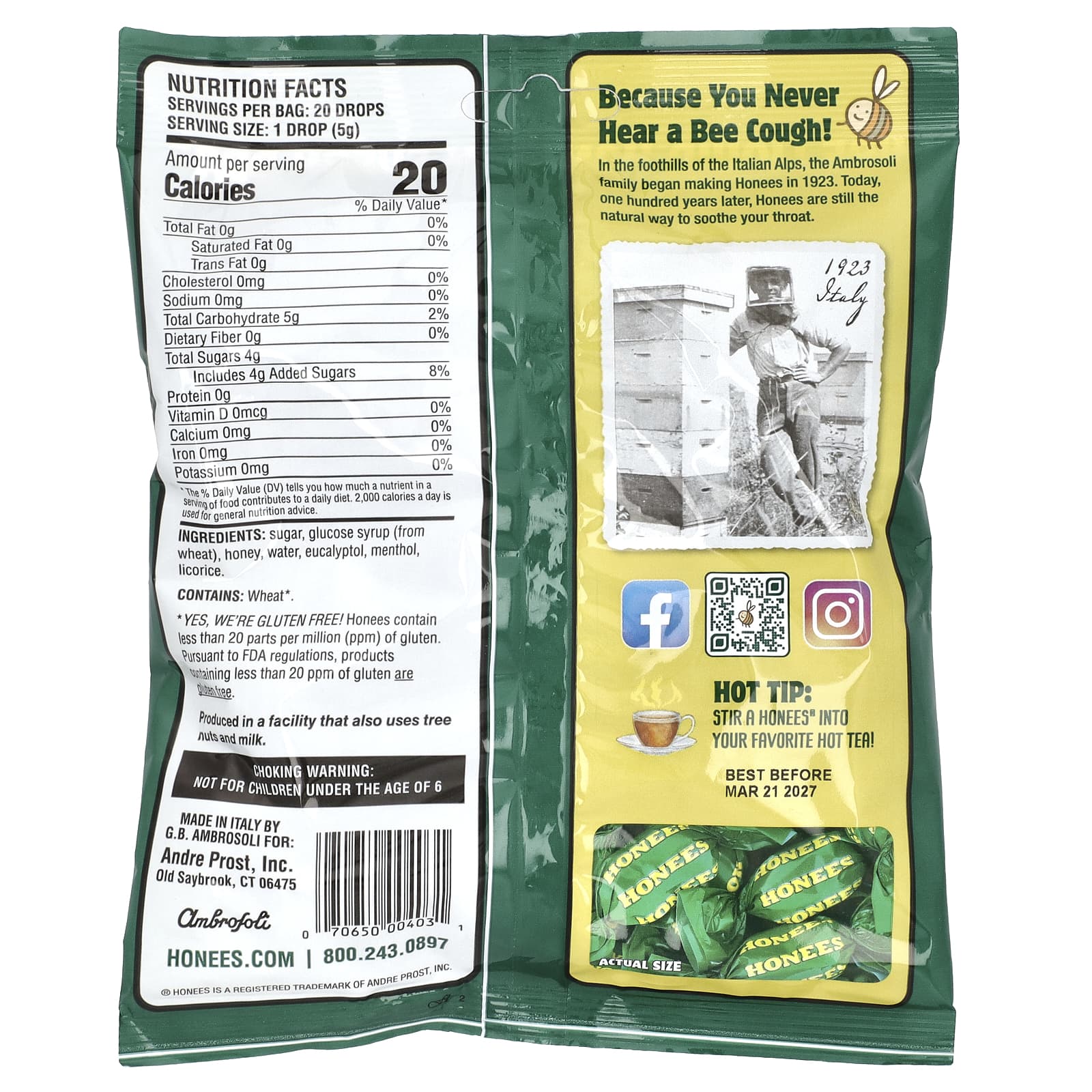 Açúcar, xarope de glicose (de trigo), mel, água, óleo de eucalipto, mentol, alcaçuz.