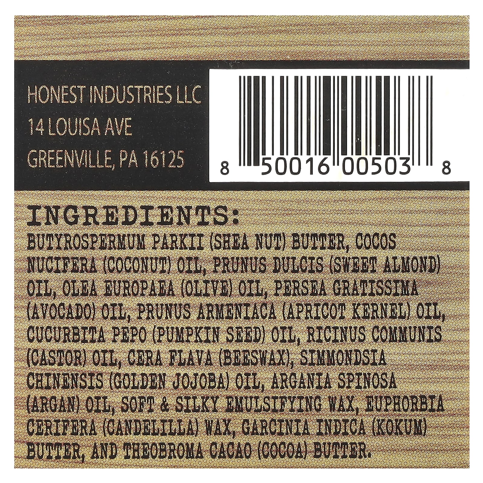 Butyrospermum parkii (noz de karité), óleo de Cocos nucifera (coco), óleo de Prunus dulcis (amêndoa doce), óleo de Olea europaea (azeitona), óleo de Persea gratissima (abacate), óleo de Prunus armeniaca (damasco), óleo de Cucurbita pepo (semente de abóbora), óleo de Ricinus communis (rícino), cera flava (cera de abelha), óleo de Simmondsia chinensis (jojoba dourado), óleo de Argania spinosa (argão), macio e & cera emulsionante sedosa, cera de Euphorbia cerifera (candelila), manteiga de Garcinia indica (kokum), e manteiga de Theobroma cacao (cacau).