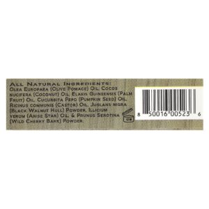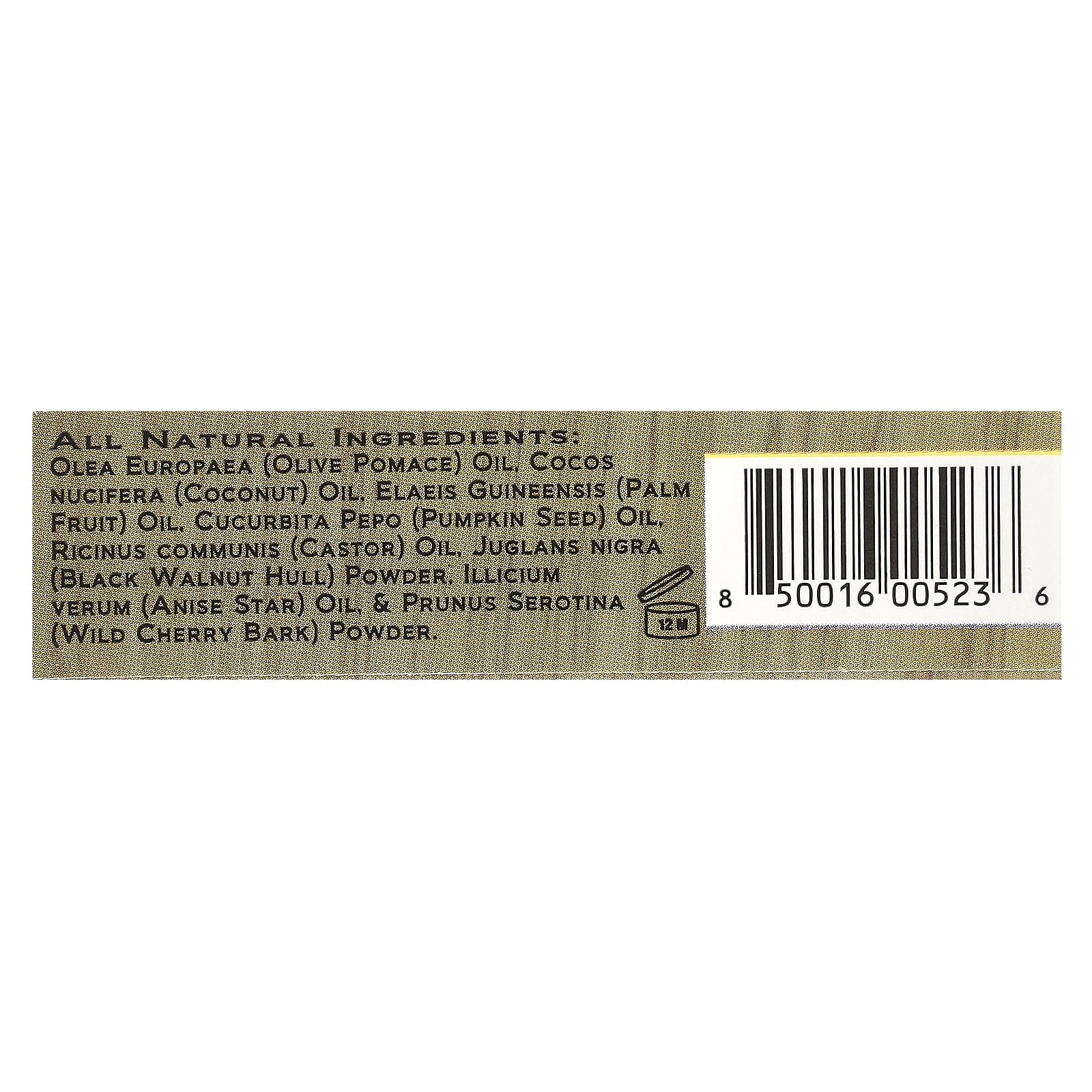 Óleo de Olea europaea (bagaço de oliva), óleo de Cocos nucifera (coco), óleo de Elaeis guineensis (fruta de palma), óleo de Cucurbita pepo (semente de abóbora), óleo de Ricinus communis (rícino), Pó de Juglans nigra (casca de nogueira-preta), óleo de Illicium verum (anis-estrela), & Pó de Prunus serotina (casca de cereja silvestre)