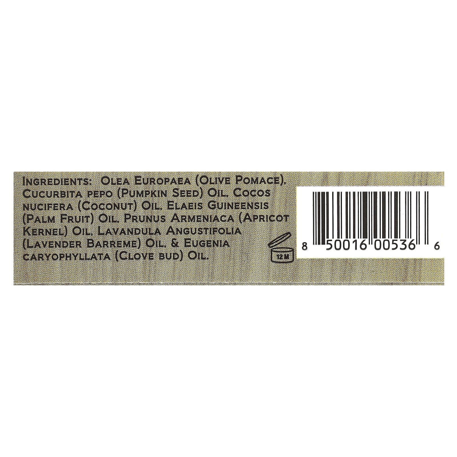 Olea europaea (bagaço de oliva), óleo de Cucurbita pepo (semente de abóbora), Cocos nucifera (óleo de coco), óleo de Elaeis guineensis (fruta de palma), óleo de Prunus armeniaca (damasco), óleo de Lavandula angustifolia (lavanda barreme), & óleo de Eugenia caryophyllus (botão de cravo).