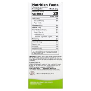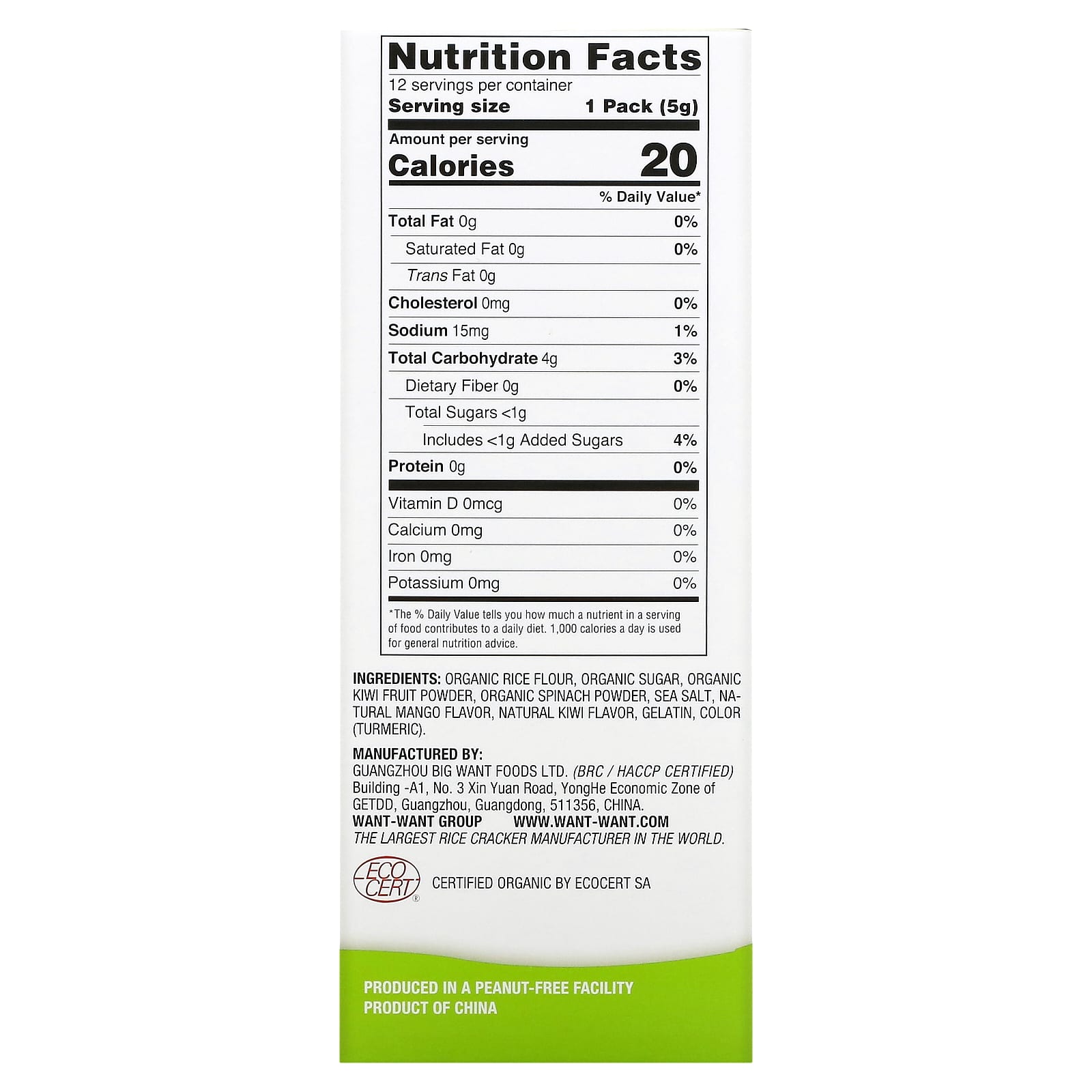 Farinha de arroz orgânico, açúcar orgânico, pó de kiwi orgânico, pó de espinafre orgânico, sal marinho, sabor natural de manga, sabor natural de kiwi, gelatina, cor (cúrcuma).
