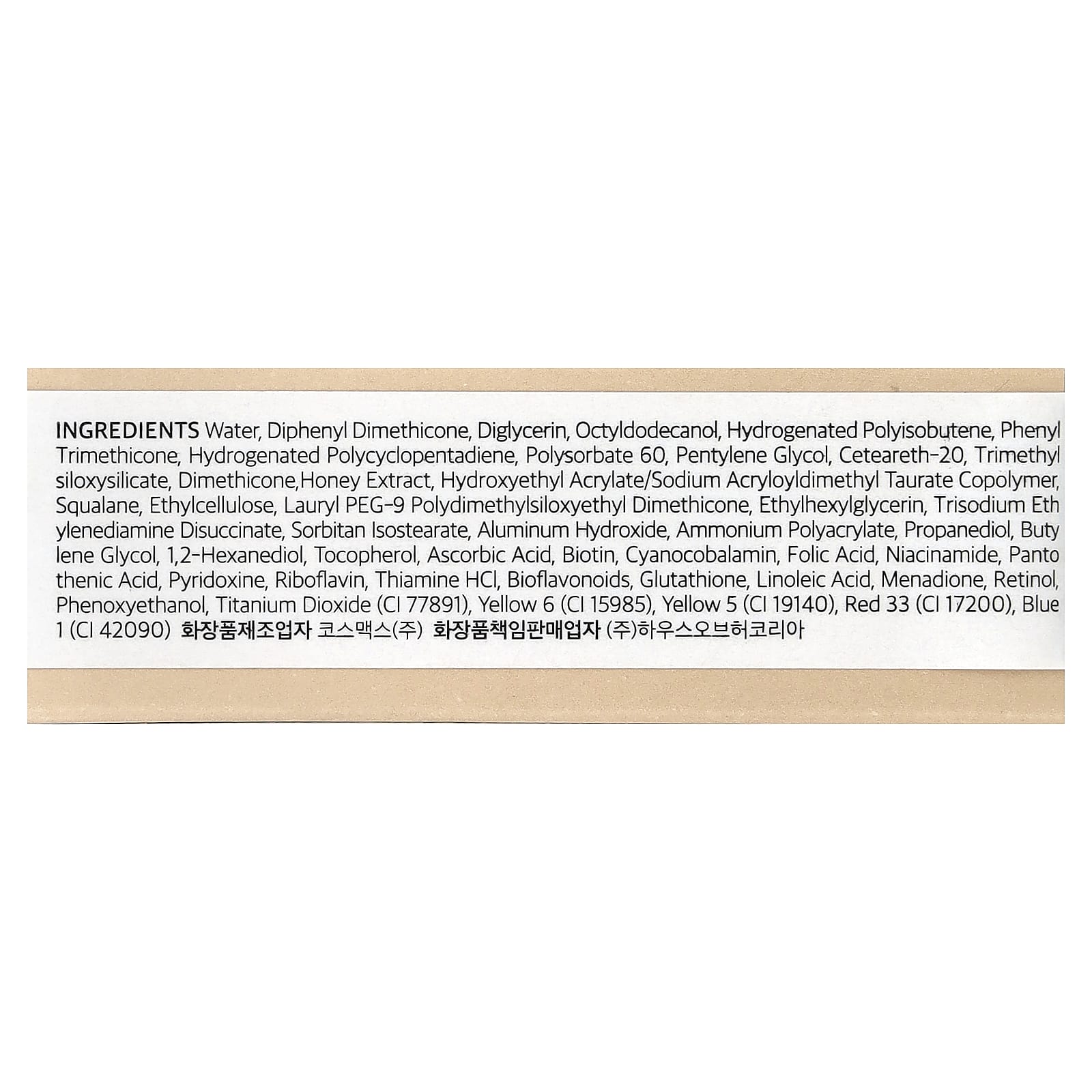 Água, difenil dimeticona, diacilglicerol, octildodecanol, poliisobuteno hidrogenado, phenyl trimethicone, hydrogenated polycyclopentadiene, polissorbato 60, pentilenoglicol, ceteareth-20, trimethylsiloxysilicate, dimeticona, extrato de mel, copolímero de acriloildimetiltaurato de sódio e acrilato de hidroxietila, esqualano, etilcelulose, lauryl peg-9 polydimethylsiloxyethyl dimethicone, ethylhexylglycerin, trisodium ethylenediamine disuccinate, isoestearato de sorbitana, hidróxido de alumínio, poliacrilato de amônio, propanediol, butilenoglicol, 1,2-hexanediol, tocoferol, ácido ascórbico, biotina, cianocobalamina, ácido fólico, nicotinamida, ácido pantotênico, piridoxina, riboflavina, cloridrato de tiamina, bioflavonoides, glutationa, ácido linoleico, menadiona, retinol, fenoxietanol, dióxido de titânio (CI 77891), amarelo crepúsculo (CI 15985), amarelo 5 (CI 19140), vermelho 33 (CI 17200), azul brilhante 1 (CI 42090).