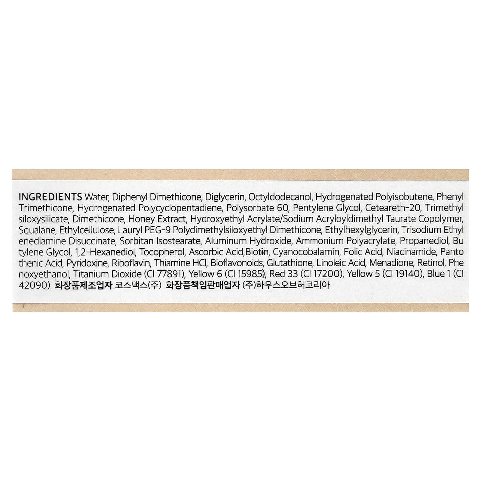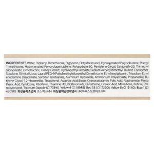 Água, difenil dimeticona, diacilglicerol, octildodecanol, poliisobuteno hidrogenado, phenyl trimethicone, hydrogenated polycyclopentadiene, polissorbato 60, pentilenoglicol, ceteareth-20, trimethylsiloxysilicate, dimeticona, extrato de mel, copolímero de acriloildimetiltaurato de sódio e acrilato de hidroxietila, esqualano, etilcelulose, lauryl peg-9 polydimethylsiloxyethyl dimethicone, ethylhexylglycerin, trisodium ethylenediamine disuccinate, isoestearato de sorbitana, hidróxido de alumínio, poliacrilato de amônio, propanediol, butilenoglicol, 1,2-hexanediol, tocoferol, ácido ascórbico, biotina, cianocobalamina, ácido fólico, nicotinamida, ácido pantotênico, piridoxina, riboflavina, cloridrato de tiamina, bioflavonoides, glutationa, ácido linoleico, menadiona, retinol, fenoxietanol, dióxido de titânio (CI 77891), amarelo crepúsculo (CI 15985), vermelho 33 (CI 17200), amarelo 5 (CI 19140), azul brilhante 1 (CI 42090).