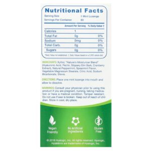Embora o sabor natural de menta doce da HylaMint ajude a refrescar o hálito, o poder de suporte da hidratação vem de uma combinação de ingredientes, que começa com o Ácido Hialurônico (uma molécula de absorção de água encontrada naturalmente em todo o corpo). A pectina de laranja, o olmo escorregadio, o extrato de cranberry e o xilitol da HylaMints fornecem ainda hidratação — naturalmente. A HylaMints é vegana, sem glúten e não contém ingredientes artificiais.