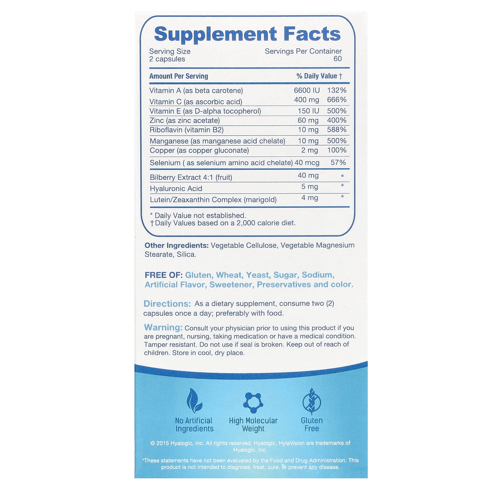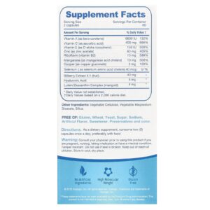 Assim como o resto do corpo, seus olhos precisam de uma nutrição adequada para se manterem saudáveis e manterem as funções diárias que não são valorizadas. Ácido Hialurônico, bem como Luteína, Zeaxantina, Mirtilo Europeu, Vitaminas A, C, E e Zinco foram adicionados para criar um produto de saúde visual completo para pessoas de todas as idades.