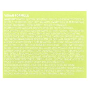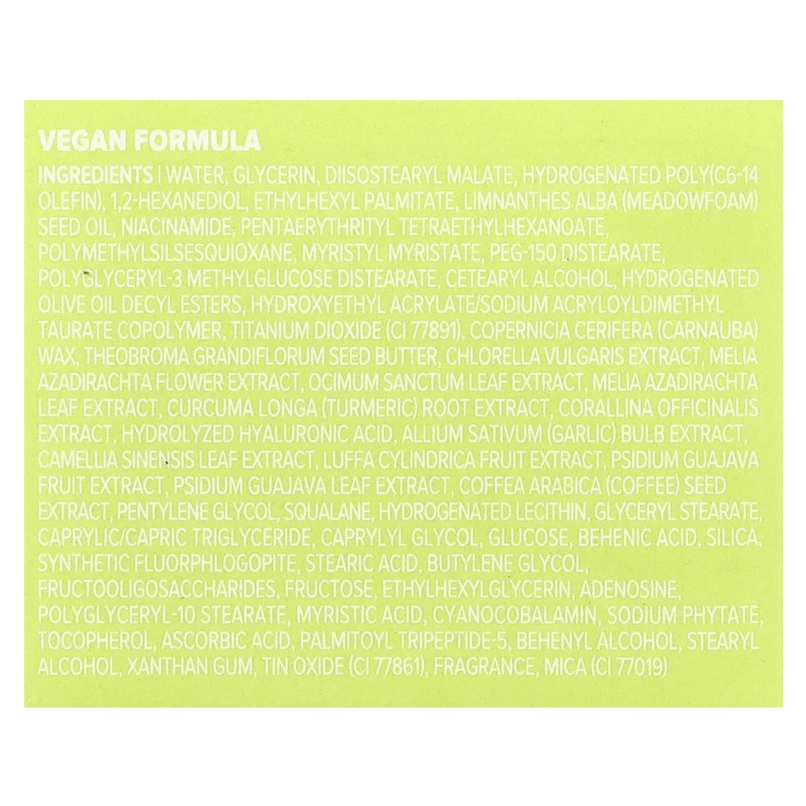 Água, glicerina, diisostearyl malate, poli-hidrogenada (olefina c6-14), 1,2-hexanediol, ethylhexyl palmitate, óleo da semente de Limnanthes alba (meadowfoam), nicotinamida, pentaerythrityl tetraethylhexanoate, polymethylsilsesquioxane, myristyl myristate, peg-150 distearate, polyglyceryl-3 methylglucose distearate, álcool cetoestearílico, ésteres de decyl de óleo de oliva hidrogenado, copolímero de acriloildimetiltaurato de sódio e acrilato de hidroxietila, dióxido de titânio (CI 77891), cera de Copernicia cerifera (carnaúba), manteiga de semente de Theobroma grandiflorum, extrato de Chlorella vulgaris, extrato da flor de Melia azadirachta, extrato da folha de Ocimum sanctum, extrato da folha de Melia azadirachta, extrato da raiz de Curcuma longa (cúrcuma), extrato de Corallina officinalis, ácido hialurônico hidrolisado, extrato do bulbo de Allium sativum (alho), extrato da folha de Camellia sinensis, extrato da fruta de Luffa cylindrica, extrato da fruta de Psidium guajava, extrato da folha de Psidium guajava, extrato da semente de Coffea arabica (café), pentilenoglicol, esqualano, lecitina hidrogenada, monoestearato de glicerila, caprylic/capric triglyceride, caprylyl glycol, glicose, ácido behenico, sílica, synthetic fluorphlogopite, ácido esteárico, butilenoglicol, fruto-oligossacarídeos, frutose, ethylhexylglycerin, adenosina, polyglyceryl-10 stearate, ácido mirístico, cianocobalamina, fitato de sódio, tocoferol, ácido ascórbico, palmitoyl tripeptide-5, behenyl alcohol, álcool estearílico, goma xantana, óxido de estanho (CI 77861), fragrância, mica (CI 77019).