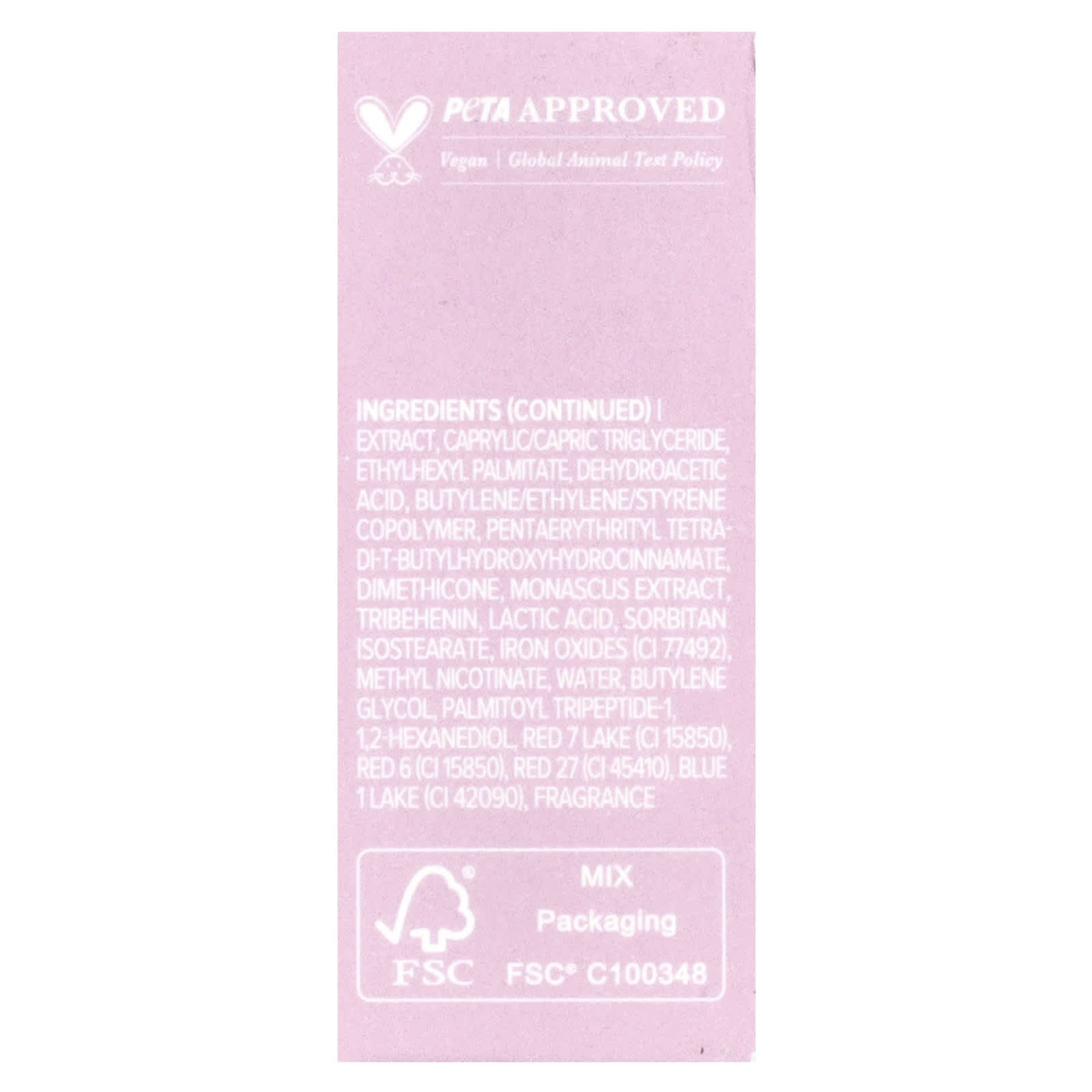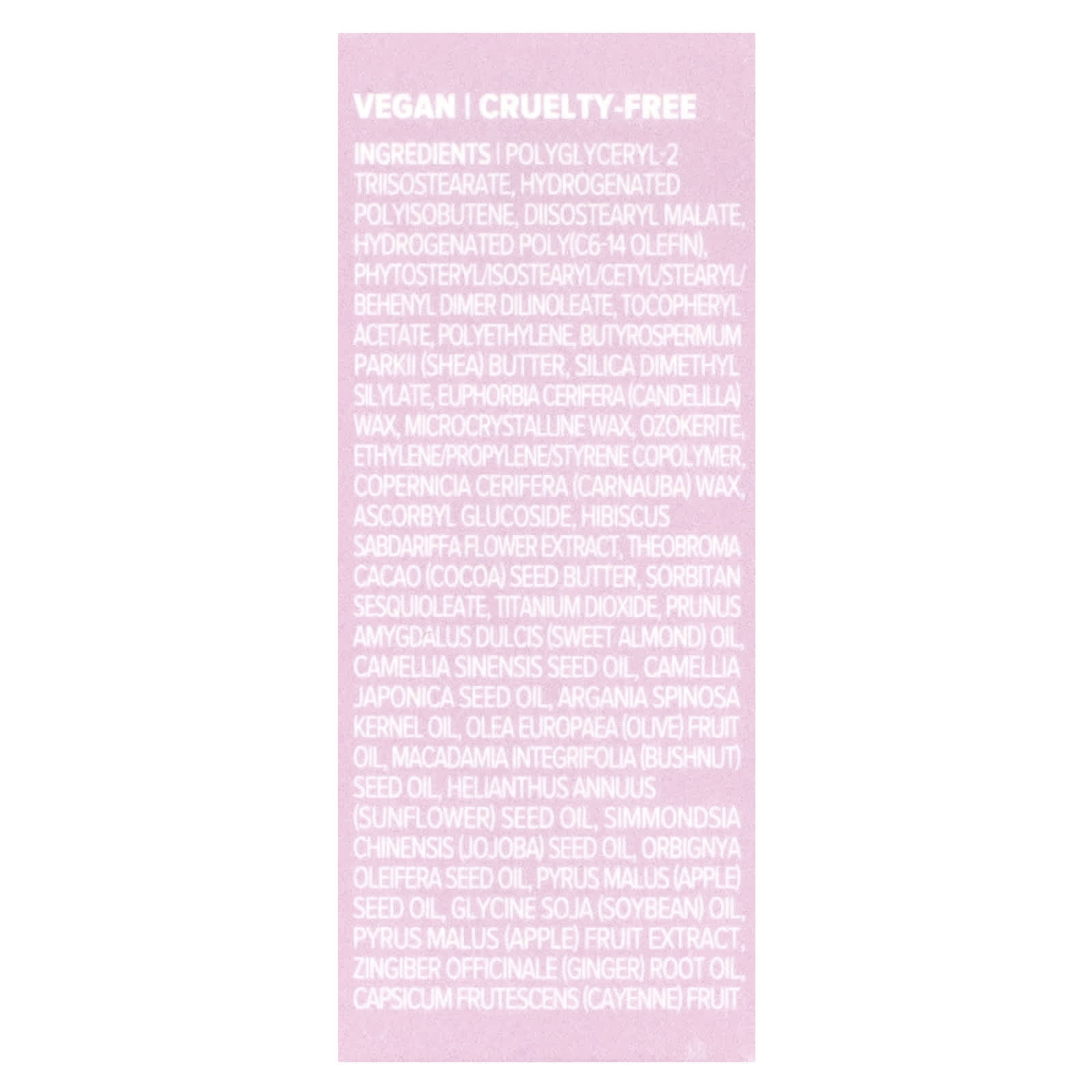 Triisostearate de poliglicerila-2, poliisobuteno hidrogenado, diisostearyl malate, fitoesterol/isoestearil/cetil/estearil behenil dilinoleato de poli-hidrogenada, acetato de tocoferol, polietileno, manteiga de Butyrospermum parkii (karité), silica dimethyl silylate, cera de Euphorbia cerifera (candelila), cera microcristalina, copolímero de etileno/propileno/estireno ozocerita. cera de Copernicia cerifera (carnaúba) e ascorbyl glucoside, extrato da flor de Hibiscus sabdariffa, manteiga da semente de Theobroma cacao (cacau), sesquioleato de sorbitana, dióxido de titânio, óleo de Prunus amygdalus dulcis (amêndoa doce), óleo da semente de Camellia sinensis, óleo da semente de Camellia japonica, óleo do grão de Argania spinosa, óleo da fruta de Olea europaea (azeitona), óleo da semente de Macadamia integrifolia (bushnut), óleo da semente de Helianthus annuus (girassol), óleo da semente de Simmondsia chinensis (jojoba), óleo da semente de Orbignya oleifera, óleo da semente de Pyrus malus (maçã), óleo de Glycine soja (soja), extrato da fruta de Pyrus malus (maçã), óleo da raiz de Zingiber officinale (gengibre), fruto de Capsicum frutescens (pimenta-caiena), extrato, caprylic/capric triglyceride ethylhexyl palmitate, dehydroacetic acid, copolímero de butileno/etileno/estireno, pentaerythryl tetra di-t-butilhydroxyhydrocinnamate dimethicone, extrato de Monascus tribohenin, ácido láctico, estearato de sorbitana, óxidos de ferro (CI 77492) methyl nicotinate, água, butilenoglicol, palmitoyl tripeptides 1. 1,2-hexanediol, vermelho 7 laca de alumínio (CI 15850) vermelho 6 (CI 15850), vermelho 27 (CI 45410), azul brilhante laca de alumínio (CI 42090), fragrância.