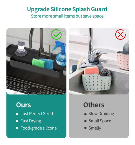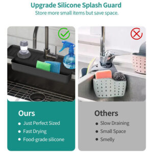 Atualize sua organização de cozinha O design extra e a saída de drenagem extra larga permitem uma rápida limpeza e manutenção e drenagem eficiente. Com nosso protetor de torneira, você não precisa mais se preocupar com respingos de água por toda a pia da cozinha.