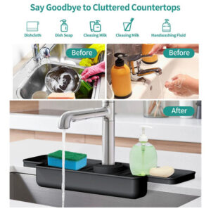 Organizador de pia versátil O tapete de drenagem de torneira atualizado não é apenas um protetor, mas também um organizador de pia. O compartimento de armazenamento foi projetado para armazenar ferramentas de limpeza, pincéis, esponjas, etc., otimizando o espaço da pia e mantendo o espaço da cozinha organizado e arrumado.