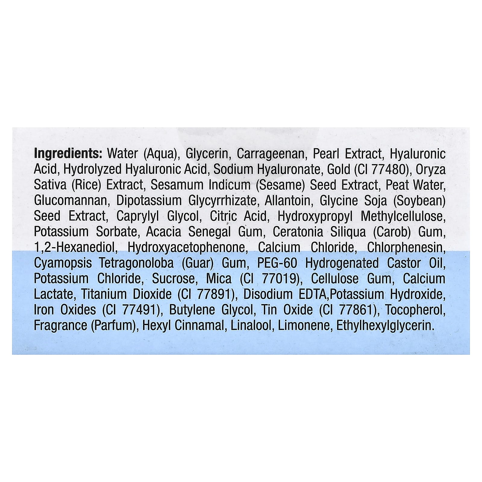 Água (Aqua), Glicerina, Carragenina, Extrato de Pérolas, Ácido Hialurônico, Ácido Hialurônico Hidrolisado, Hialuronato de Sódio, Ouro (CI 77480), Extrato de Oryza sativa (Arroz), Extrato da Semente de Sesamum indicum (Gergelim), Água de Turfa, Glucomanan, Dipotassium Glycyrrhizate, Alantoína, Extrato da Semente de Glycine soja (Soja), Caprylyl glycol, Ácido Cítrico, Hidroxipropilmetilcelulose, Sorbato de Potássio, Goma de Acacia Senegal, Goma de Ceratonia siliqua (Alfarroba), 1,2-hexanediol, Hydroxyacetophenone, Cloreto de Cálcio, Clorfenesina, Goma de Cyamopsis tetragonoloba (Guar), Óleo de Rícino Hidrogenado PEG-60, Cloreto de Potássio, Sacarose, Mica (CI 77019), Goma de Celulose, Lactato de Cálcio, Dióxido de Titânio (CI 77891), Edetato Dissódico, Hidróxido de Potássio, Óxidos de Ferro (CI 77491), Butilenoglicol, Óxido de Estanho (CI 77861), Tocoferol, Fragrância (Perfume), Hexyl Cinnamal, Linalol, Limoneno, Ethylhexylglycerin.
