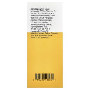 Água (Aqua), Propanediol, PPG-24-Glicero-24, Glicerina, Ácido 3-O-Etil Ascórbico, Extrato da Fruta de Terminalia ferdinandiana (Amexa de Kakadu), Extrato de Polygonum aviculare (Reynoutria japonica), 1,2-Hexanediol, Sodium Polyacryloyldimethyl Taurate, Caprylhydroxamic Acid, PPG-26-Buteth-26, Óleo de Rícino Hidrogenado PEG-40, Sorbato de Potássio, Benzoato de Sódio, Ácido Cítrico, EDTA Tetrassódico, Amarelo 6 Laca (CI 15985).