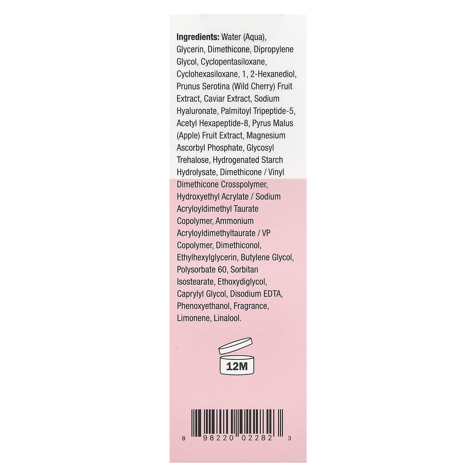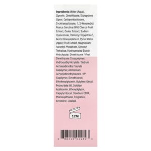 Água (Aqua), Glicerina, Dimeticona, Dimetildietilenoglicol, Decametilciclopentasiloxano, Cyclohexasiloxane, 1,2-Hexanediol, Extrato da Fruta de Prunus serotina (Cereja Silvestre), Extrato de Caviar, Hialuronato de Sódio, Palmitoyl Tripeptide-5, Acetyl Hexapeptide-8, Extrato da Fruta de Pyrus malus (Maçã), Magnesium Ascorbyl Phosphate, Glycosyl Trehalose, Hidrolisado de Amido Hidrogenado, Dimethicone / Vinyl Dimethicone Crosspolymer, Hydroxyethyl Acrylate/Sodium Acryloyldimethyl Taurate Copolymer, Ammonium Acryloyldimethyltaurate/VP Copolymer, Dimeticonol, Ethylhexylglycerin, Butilenoglicol, Polissorbato 60, Isoestearato de Sorbitano, Éter Dietilenoglicol Monoetílico, Caprylyl glycol, Edetato Dissódico, Fenoxietanol, Fragrância, Limoneno, Linalool.