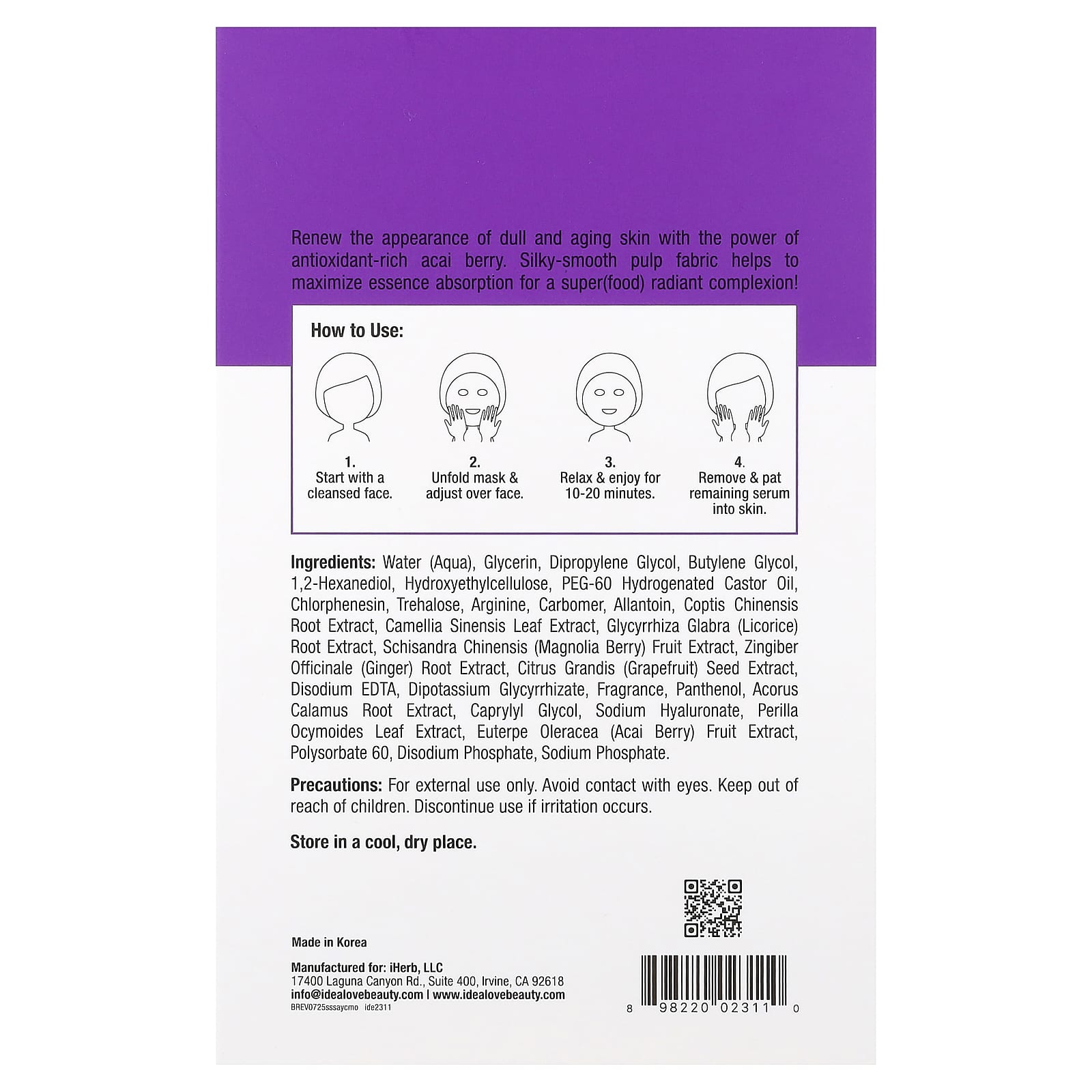 Mime-se com um dia de spa em casa com Idealove™ Superfood Skin Savior, Acai You Checking Me Out . Esta máscara facial com infusão de superalimento renova a aparência da pele opaca e envelhecida com o poder do açaí rico em antioxidantes. Feita com tecido de celulose macio e sedoso, a máscara ajuda a maximizar a absorção da essência para proporcionar uma tez superalimentada e radiante!