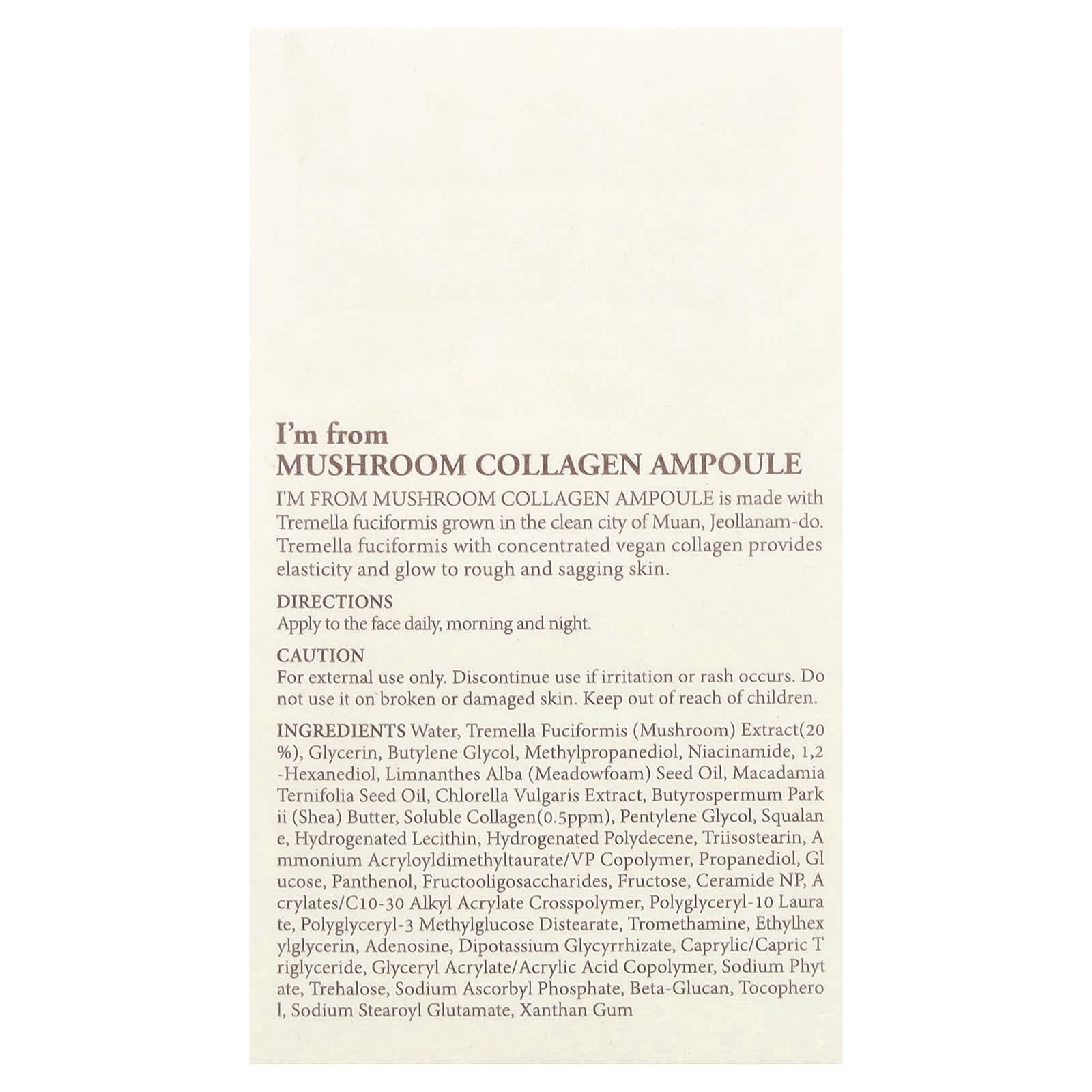 A Ampola de Colágeno I’m FROM Mushroom é feita com Tremella fuciformis cultivada na limpa cidade de Muan, Jeollanam-do. Tremella fuciformis com colágeno vegano concentrado fornece elasticidade e brilho à pele áspera e flácida.