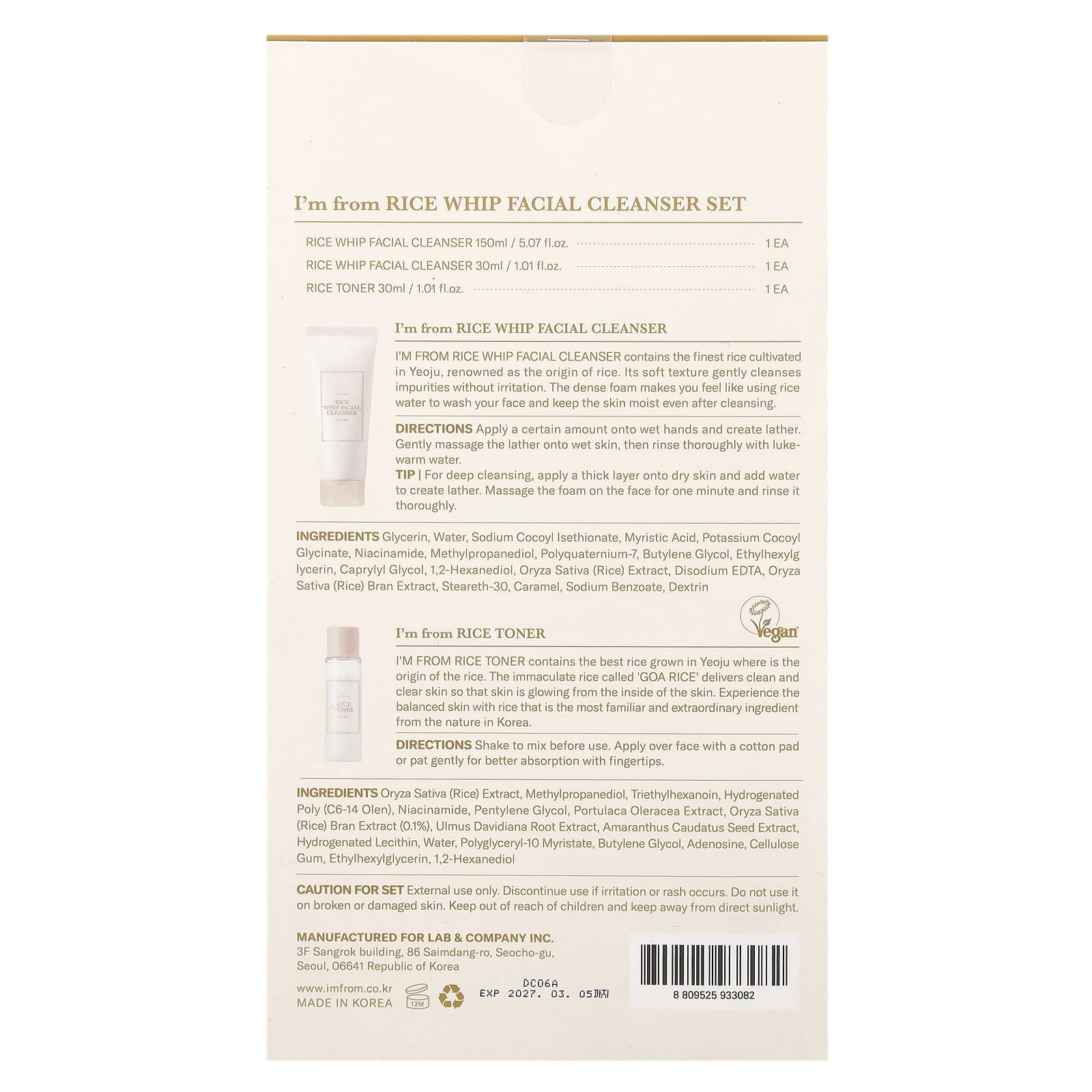 Solução de Limpeza Facial Rice Whip da I’m From: Glicerina, água, sodium cocoyl isethionate, ácido mirístico, potassium cocoyl glycinate, nicotinamida, methylpropanediol, poliquatérnio-7, butilenoglicol, ethylhexylglycerin, caprylyl glycol, 1,2-hexanediol, extrato de Oryza sativa (arroz), edetato dissódico, extrato do farelo de Oryza sativa (arroz), estearato-30, caramelo, benzoato de sódio, dextrina.