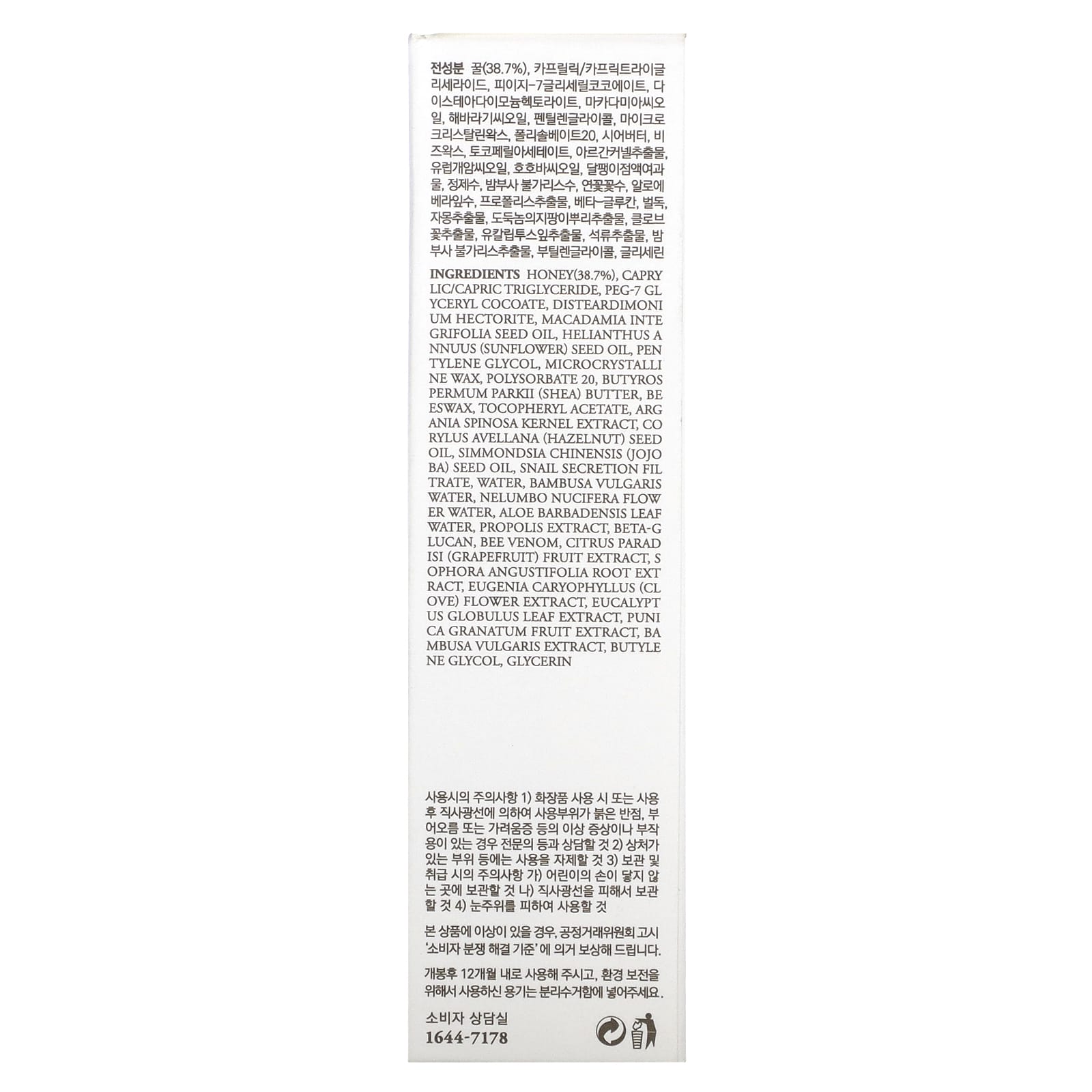 Mel (38,7%), caprylic/capric triglyceride, peg-7 gliceril cocoato, disteardimonium hectorite, óleo da semente de Macadamia integrifolia, óleo da semente de Helianthus annuus (girassol), pentilenoglicol, cera microcristalina, polissorbato 20, manteiga de Butyrospermum parkii (karité), cera de abelha, acetato de tocoferol, extrato do grão de Argania spinosa, óleo da semente de corylus avellana (avelã), óleo da semente de Simmondsia chinensis (jojoba), filtrado de secreção de caracol, água, água de Bambusa vulgaris, água da flor de Nelumbo nucifera, água da folha de Aloe barbadensis, extrato de própolis, betaglucano, veneno de abelha, extrato da fruta de Citrus paradisi (toranja), extrato da raiz de Sophora angustifolia, extrato da flor de Eugenia caryophyllus (cravo), extrato de folha de Eucalipto globulus, extrato da fruta Punica granatum, extrato de Bambusa vulgaris, butylene glycol, glicerina.