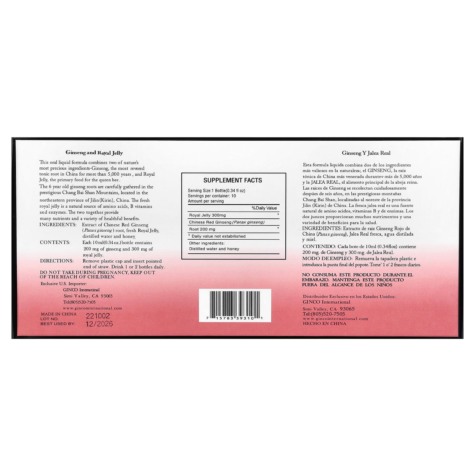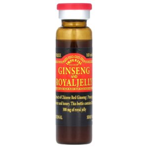 Cada frasco de 10 ml (0,34 oz) contém 200 mg de ginseng e 300 mg de geléia real.