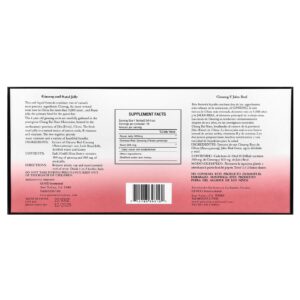 As raízes do ginseng de 6 anos são cuidadosamente colhidas nas prestigiosas montanhas de Chang Bai Shan, localizadas na província de Jilin (Kirin), no nordeste da China. A geleia real fresca é uma fonte rica em aminoácidos, vitaminas B (particularmente B5) e enzimas. Os dois juntos fornecem muitos nutrientes e uma variedade de benefícios saudáveis.